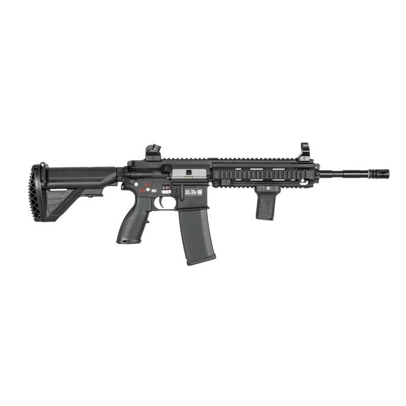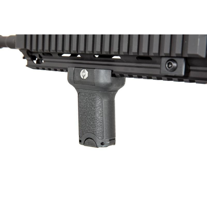 Based on the 416 the replica features a four point 20mm RIS / RAS railed hand guard, allowing for a variety of aftermarket grips, bi pods, launchers, lasers and more to be fitted. 20mm is the most common rail in Airsoft, meaning you'll have access to a wide variety of parts to truly make the replica your own. To get you started a forward vertical fore grip is included in the box.