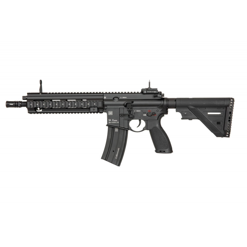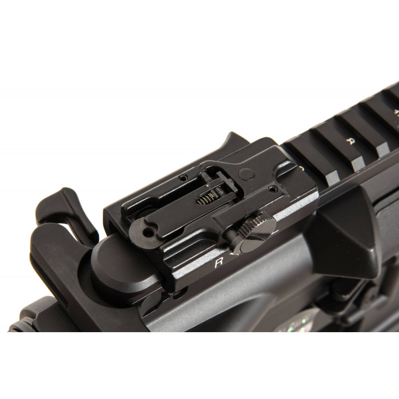 SA-H11 assault rifle replica by Specna Arms is made largely from a uniform zinc and aluminium alloy, reinforced with steel elements in the most vulnerable points of the replica (steel elements - all the screws, pins and tactical sling swivels). Both the stock storing the battery and the pistol grip were made from polymer. The receiver of the replica and RIS handguard have undergone the process of anodizing, which guarantees high degree of protection against corrosion. The paint was applied via a process of powder coating, after having the surface undergo the same process prior to the application of paint. This provides a much higher than usual resistance of the applied paint to abrasion. The receiver bears manufacturer markings.