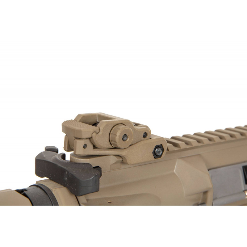 The replica is equipped with a top 22 mm RIS rail, a set of front Free Float RIS rails and an adjustable stock. Folding sights are mounted on the upper RIS rail, which do not interfere with optoelectronic sights. Thanks to the retractable stock with a non-slip texture stock, it is possible to adjust the length of the replica to the body type and preferences of the operator. The silencer is mounted on a 14-millimeter left-hand thread.