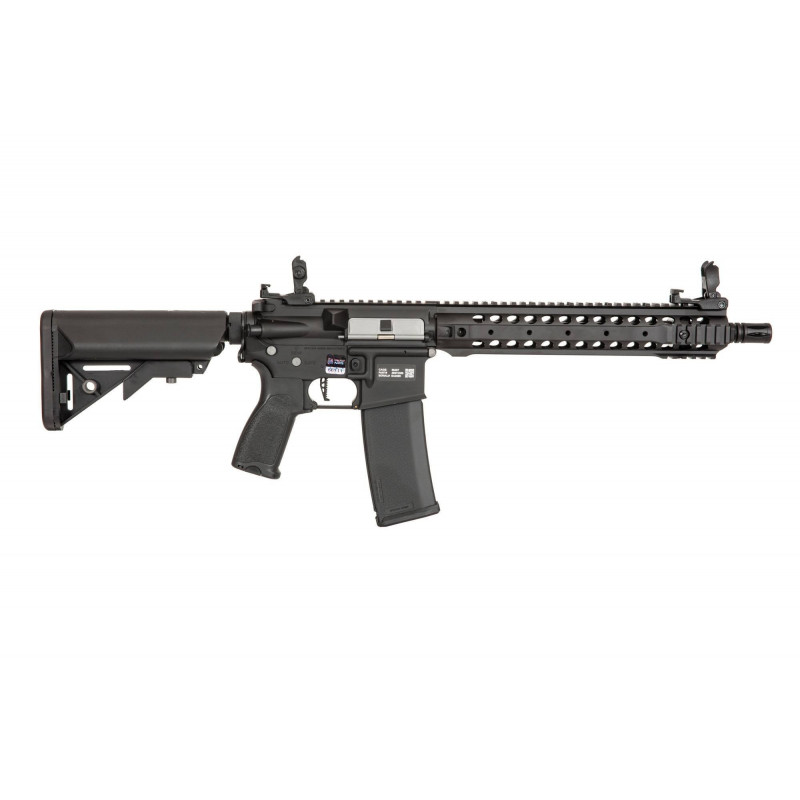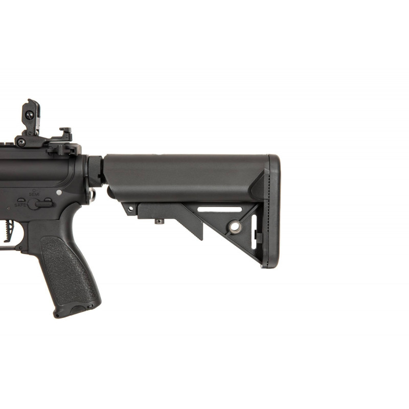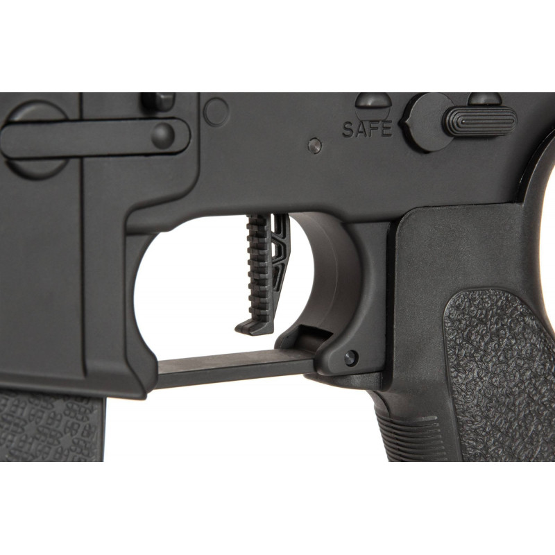SA-E06 carbine replica is equipped with a Free Float type handguard in URX / RIS 22mm mounting system that can serve as a mount for various tactical accessories: flashlights, grips, laser sights and optical sights. The barrel features a muzzle device on a 14 mm CCW thread. The top RIS rail features flip-up iron sights.