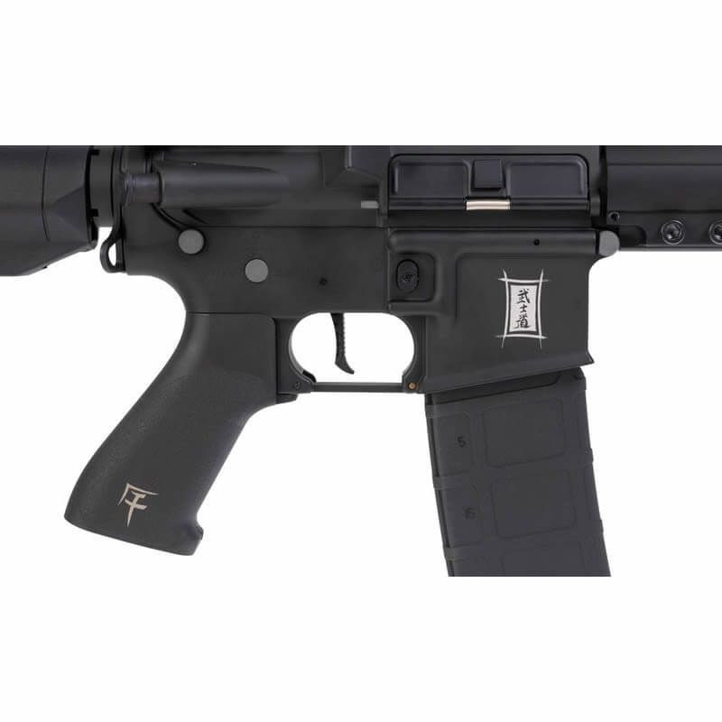 The pistol grip of the Bushido Makoto is an ergonomic "TD" style grip, a much-loved grip design amongst Airsofters and real operators alike. This grip has some added flair thanks to Saigo Defense, featuring another Japanese character marked on the right side, completing the unique look of the Bushido Makoto. The trigger guard is a standard M4/AR-15 flat type, which can be replaced with aftermarket alternative trigger guards of AEG spec. The trigger of the Bushido Makoto is a unique design, combining the speed benefits of a flat trigger with a slight curve at the tip to prevent you from slipping off the trigger during rapid strings of semi-auto fire. This trigger also looks fantastic too and contributes to the overall customized look of the Bushido Makoto.