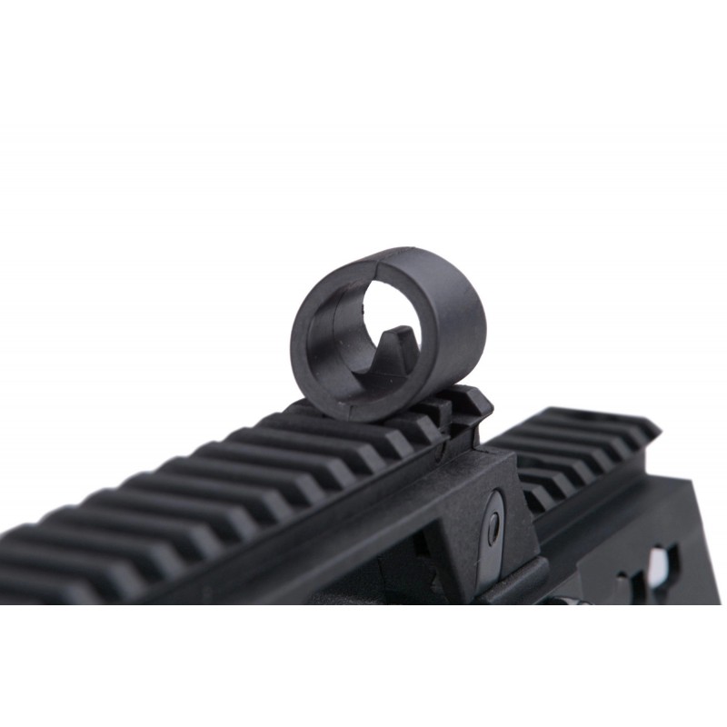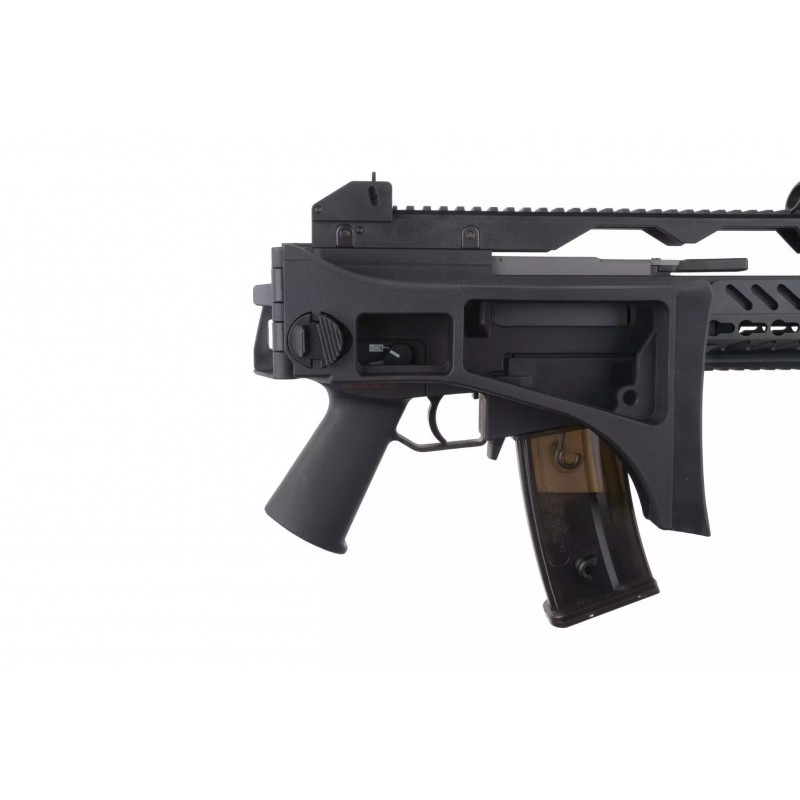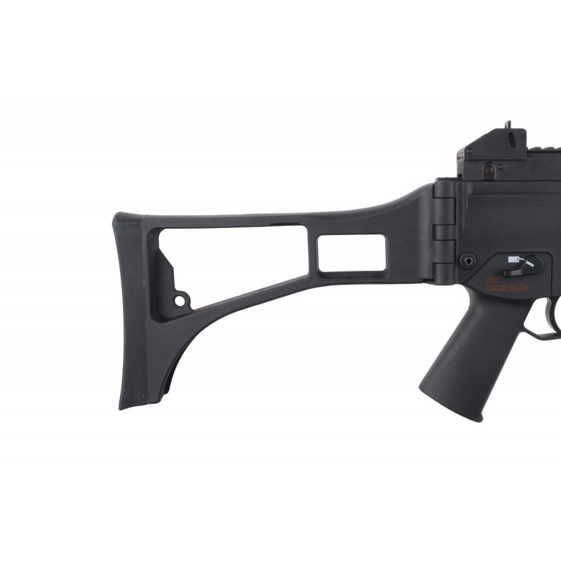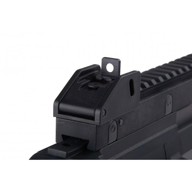 The replica is characterized by a very good fit, made from eye-pleasing matte polymer. Important components are connected by pins, allowing us to change individual elements, such as the magazine slot. The body of the replica is made of solid polymer and features an individual serial number, manufacturer's markings, and aesthetic fire selector markings. The rear of the replica includes a classic carry handle with a 22mm RIS rail as well as adjustable fixed sighting instruments. The replica has a side-folding stock, which facilitates transport and operation in tight spaces. The replica's metal barrel is finished with a flash suppressor mounted on a 14mm CW thread.