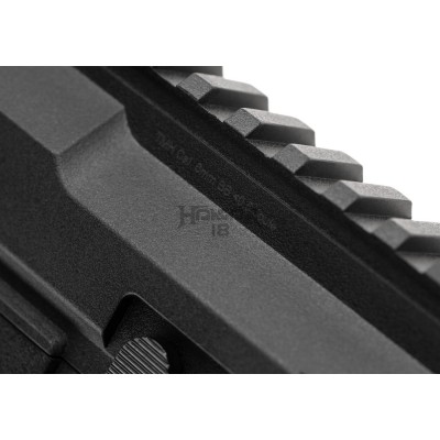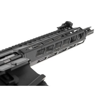 At the front, we can find a polymer M-LOK handguard with a RIS rail at the top. This setup allows the user to attach accessories suitable to preference or mission requirements.