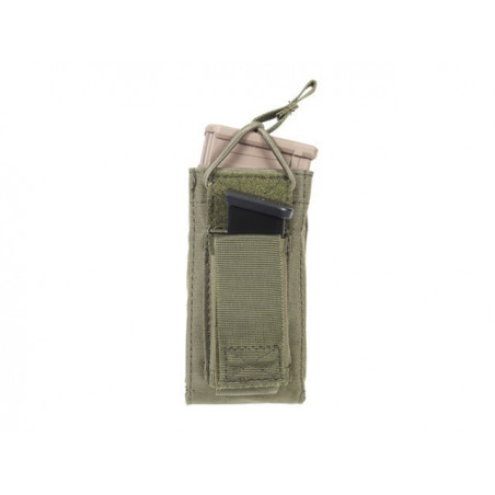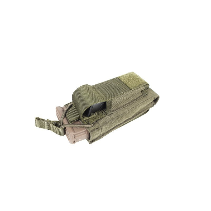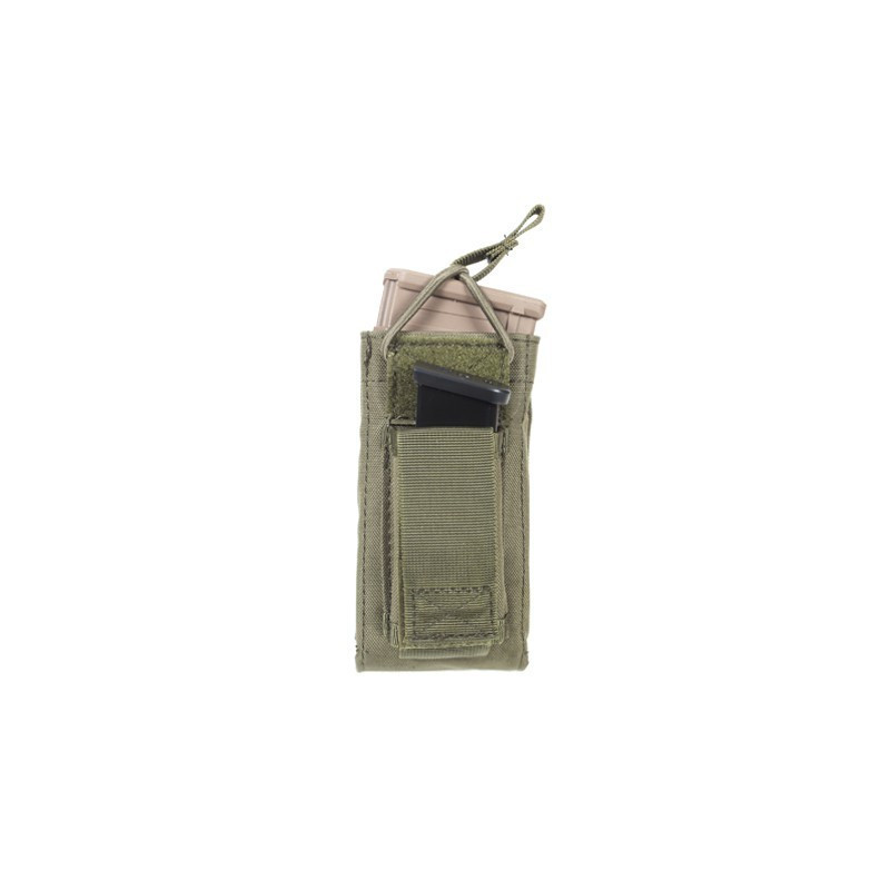 Combo magazine pouch can hold 5.56 style magazines (M4 / AR-15 / M16 / ACR / FAMAS / SCAR-L / TAVOR / SA80 / Galil / Type 89 / F2000 / AUG) and single or double stack pistol magazine (9mm) or many other accessories. The open design provides fast reload and a additional rubber cord with a comfortable grip protects magazine from falling. Compatible with all MOLLE platforms.