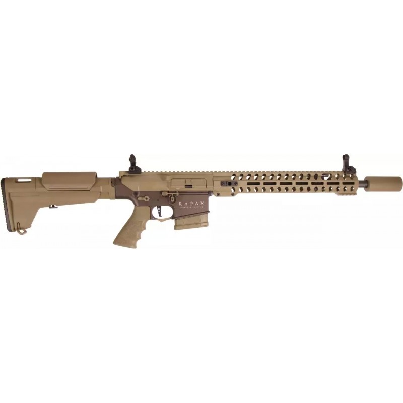 The Rapax M8 is a spectacular DMR rifle designed by Secutor and manufactured by ARES in a limited edition of which only one batch will be produced. It features a body and handguard crafted in CNC, providing great rigidity and a lightweight of just under 3 kilograms. Internally, it offers everything necessary to buy, unbox, and play, as it incorporates an electronic trigger (programmable with the Ares/Amoeba programmer), reinforced piston, bearings and 8mm bushings, precision barrel, hop-up rubber prepared for heavy BBs, and a reinforced gearbox.