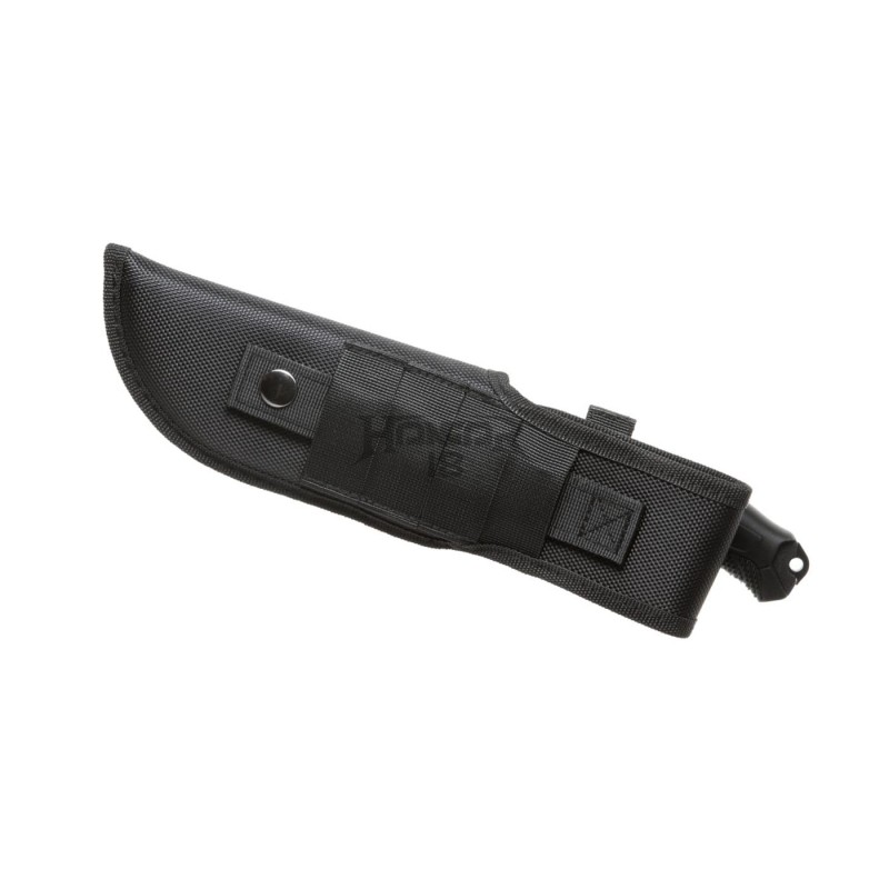 The profiled and ergonomic handle has textured scales injection molded from polymer. Moreover, it enhances control and provides a secure knife grip in almost all conditions. At the end of the handle, there is a glass breaker and a hole for a safety rope. The set also includes a practical sheath made of Cordura with a Kydex insert inside.