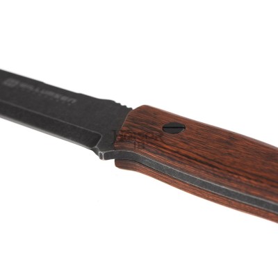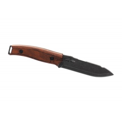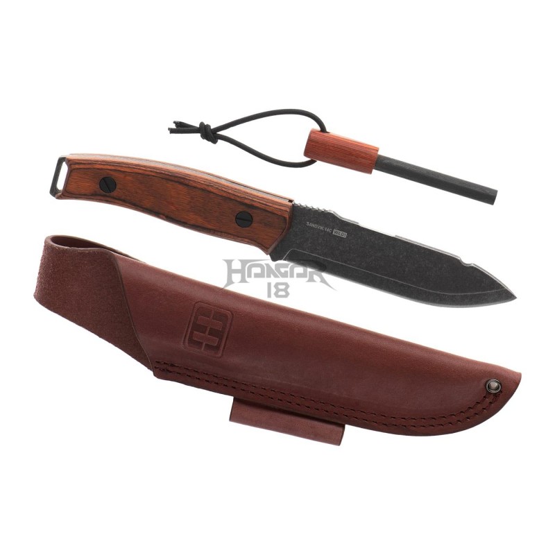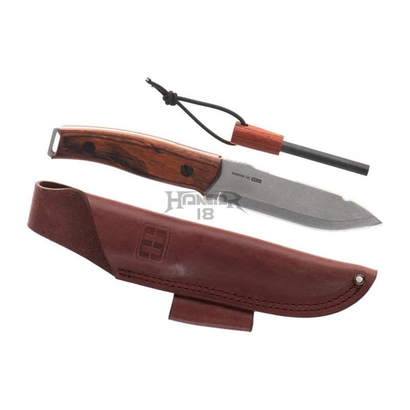 The light stonewashed blade is made of a 4mm thick Sandvik 14C steel and manufactured with a slot for the magnesium flint and friction grooves on top in a full-tang configuration.