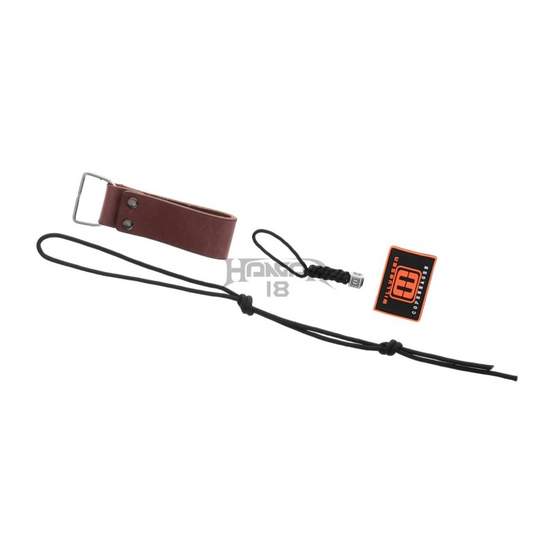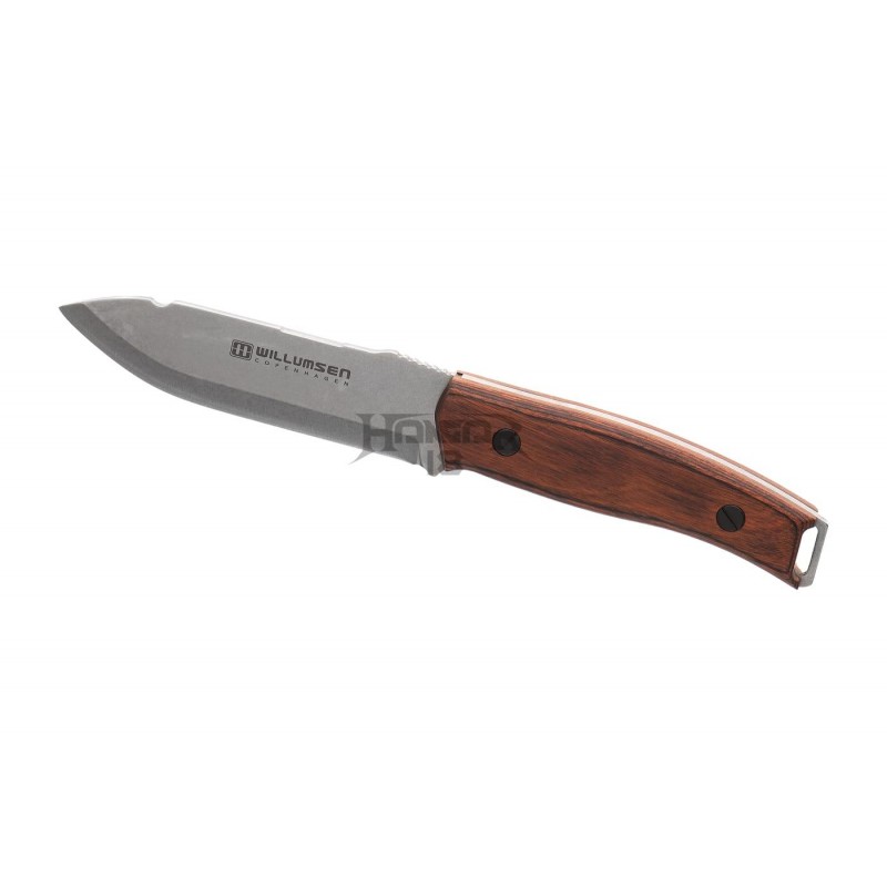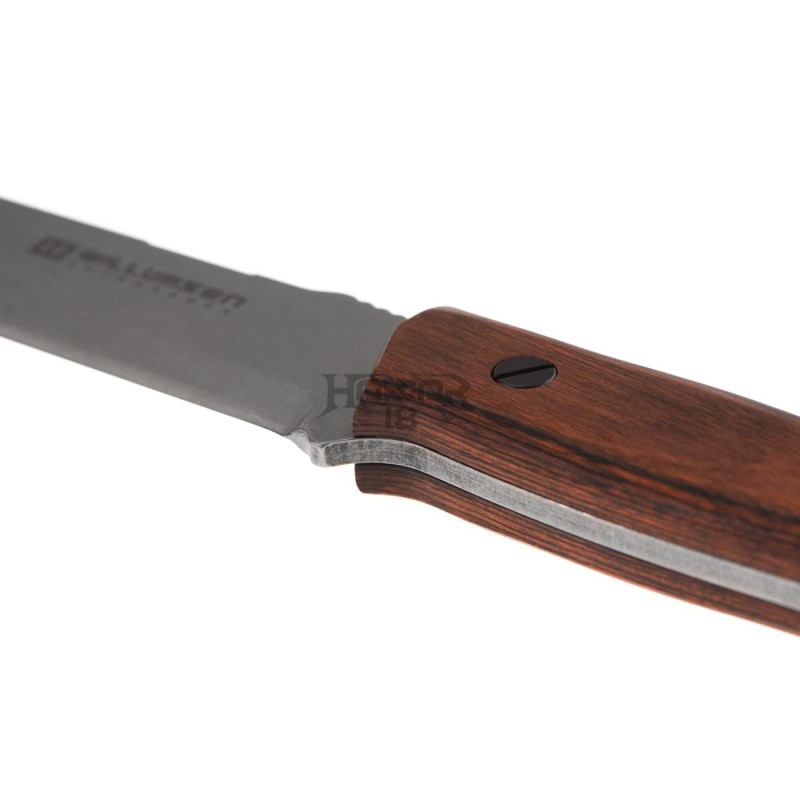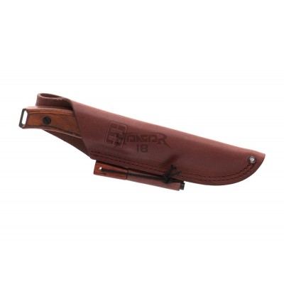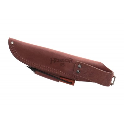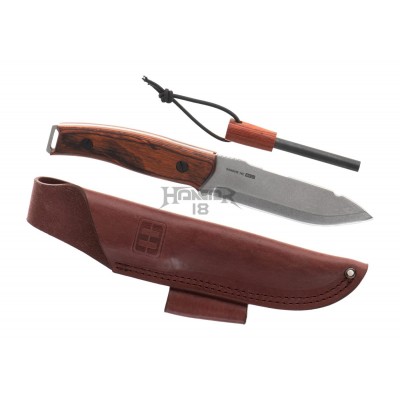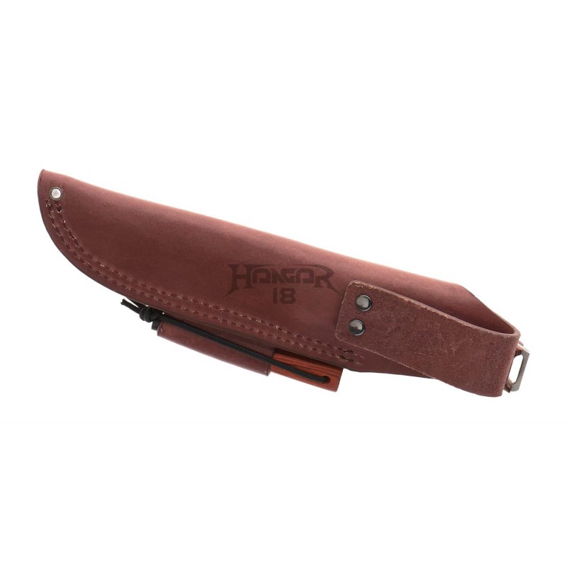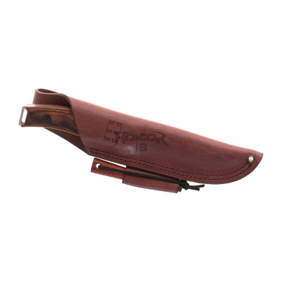 The handle made of pakkawood is mounted directly to the steel tang with a lanyard hole at the back. The sheath is made of natural cowhide and equipped with a magnesium flint in a secured compartment. A carrying loop for right-hand users with a thigh strap is also present.