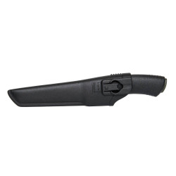 The carbon steel blade has a black DLC coating that protects against rust and also prevents reflections from the blade. Keep in mind though that carbon steel needs to be maintained, so make it a habit to wipe your knife and oil the blade after using it. The spine of the blade has been ground so that you can use it together with a fire starter – which means critical fire is never far away. The knife sheath contains a belt loop and clip so your knife is always close at hand.