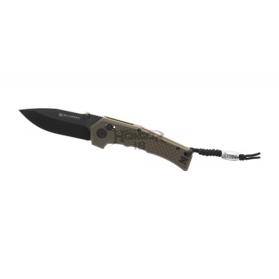 The handle is made of olive GFN polyamide and mounted to a steel frame with an Axis Lock mechanism and a lanyard hole. The removable pocket clip is available for both right and left-hand users.