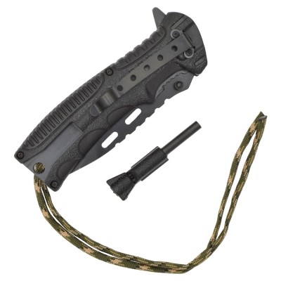 It features a 95 mm stainless steel blade, along with an integrated firestarter and cord, making it ideal for wilderness adventures.