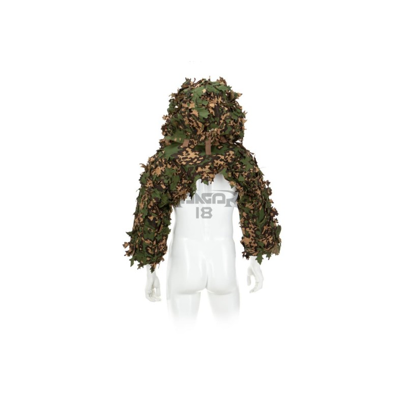 Minimalistic viper hood designed for enhanced camouflage properties and reduced weight. Typically worn over the base layer of uniform and carried equipment, this oversuit is manufactured of light yet durable fabric in a disruptive pattern. The base of the suit is a bolero-type cover with a camouflage net with leaf-shaped pieces of fabric sewn on. Adjustable chest buckle and integrated shock cords in the sleeves give the wearer a high degree of regulation and comfort.