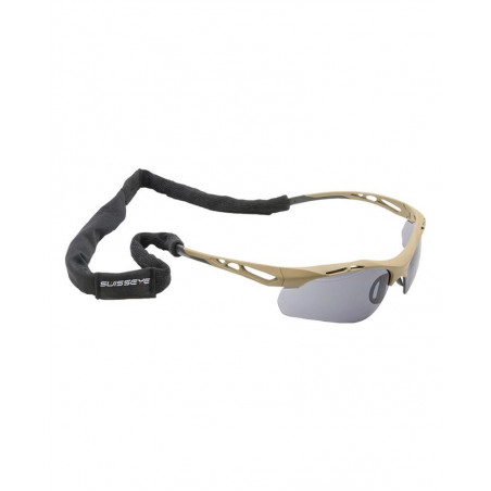 Desert ballistic goggles with box and two lenses (dark and transparent). Elastic tape fit. Lens in polycarbonate. The tape has FMA helmet fitting or equivalent.