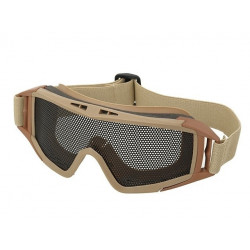 Desert ballistic goggles with box and two lenses (dark and transparent). Elastic tape fit. Lens in polycarbonate. The tape has FMA helmet fitting or equivalent.