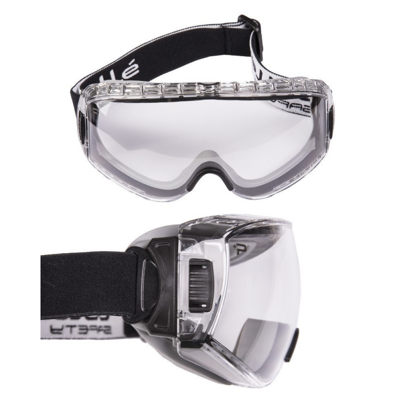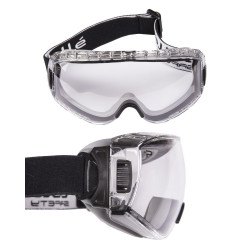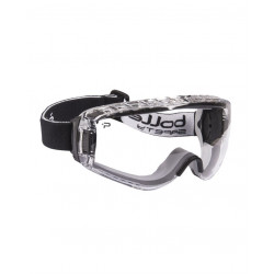 Black ballistic goggles with box and two lenses (dark and transparent). Elastic tape fit. Lens in polycarbonate. Built-in fan to prevent lens fogging.