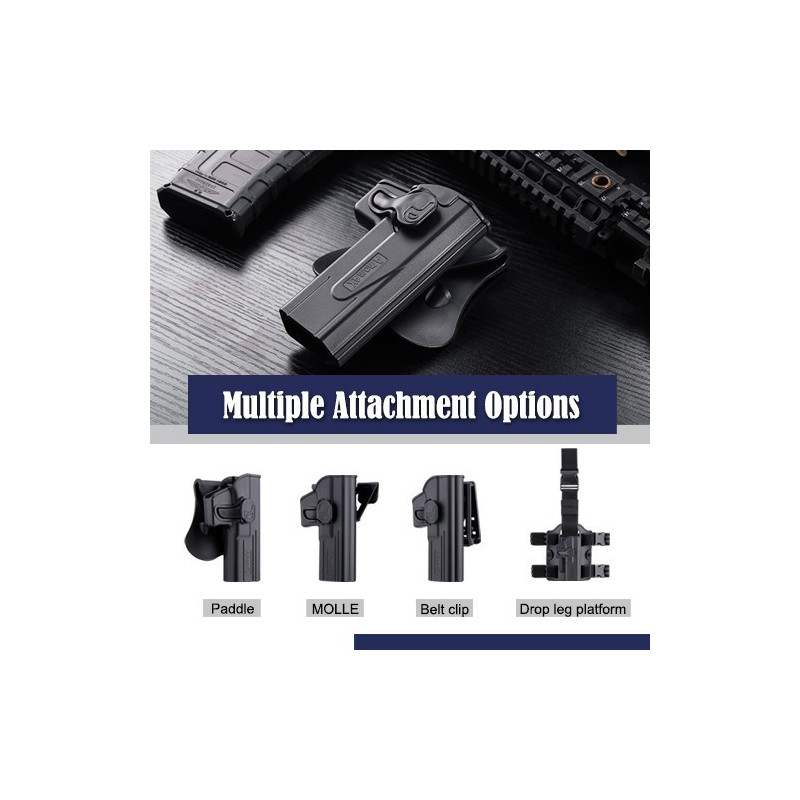 All the carrying platforms can be replaced by only one screw. User can carry them in daily use, outdoor sports, normal shooting training and competition. Holster will stay firmly on belt, leg and MOLLE system even in fast move.