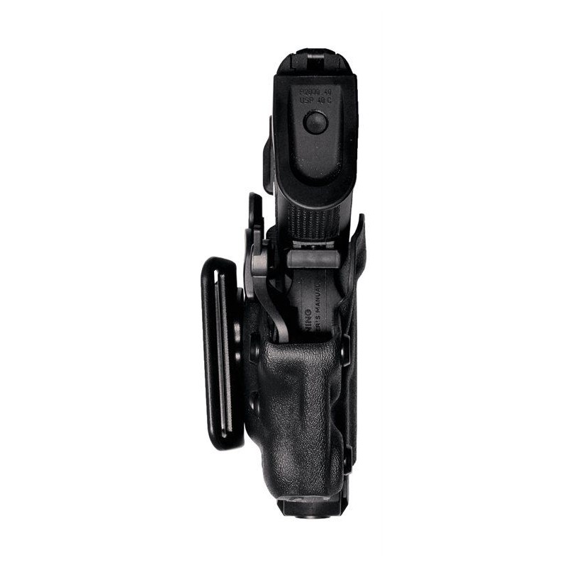 The VKS8 is a compact OWB holster designed for concealed carry, featuring an inner lining for firearm protection and noise reduction. It uses a level 2 automatic Vega Pull Side safety system, which secures the gun upon insertion and releases with a natural draw. Includes two belt attachment options — paddle or belt loop with adjustable height and cant — and is thermo-molded using Vegatek technology for precision and durability. Made in Italy from high-resistance polymer.