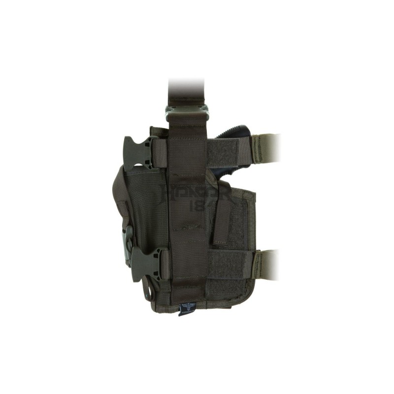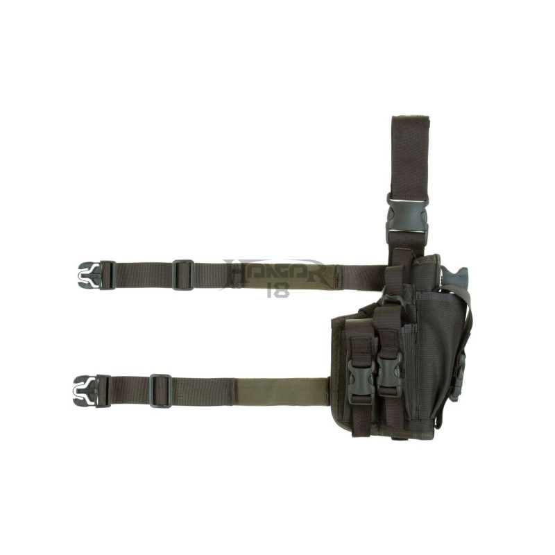 SOF holster is outfitted with three integrated magazine pouches (one is oversized and can also fit a silencer) and integrated leg panel - fastened with a belt clip and elastic straps to the thigh.