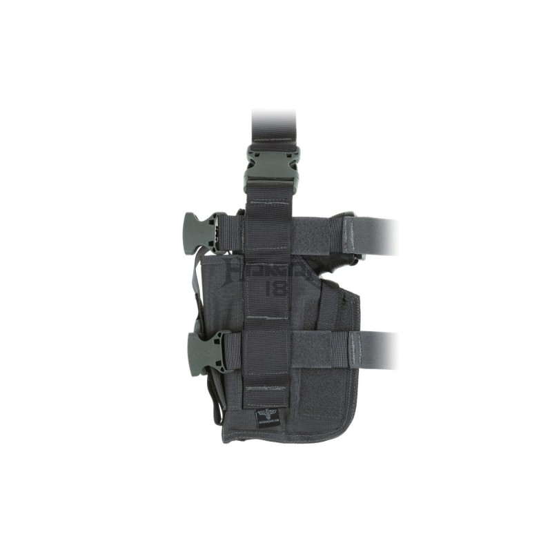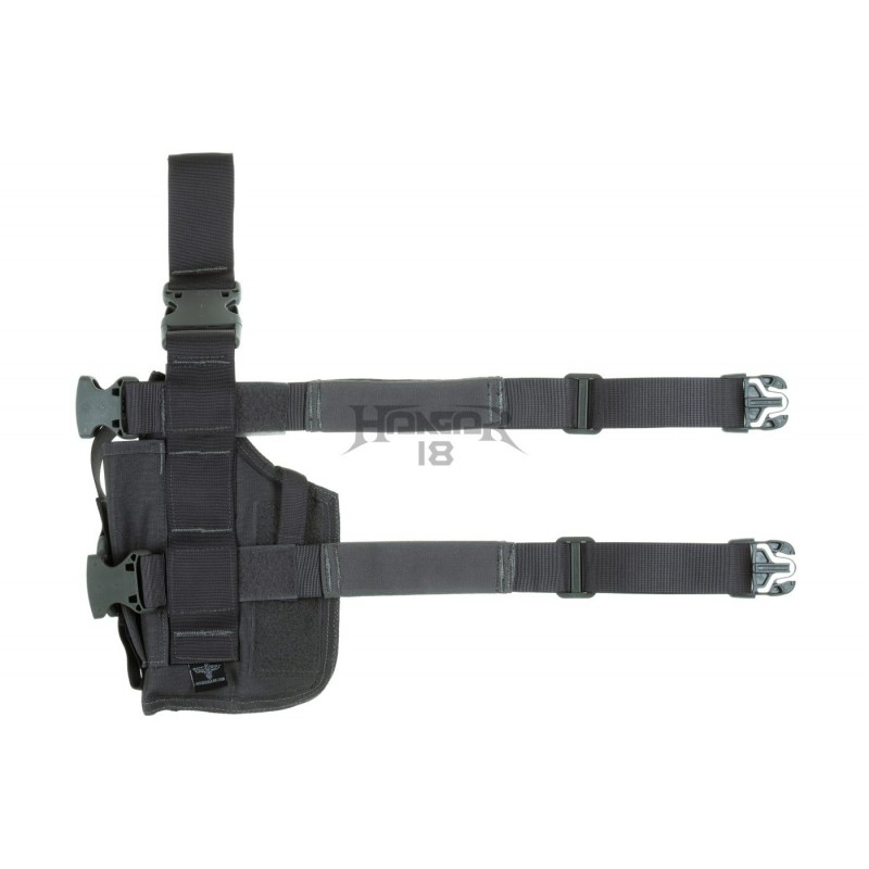 SOF holster is outfitted with three integrated magazine pouches (one is oversized and can also fit a silencer) and integrated leg panel - fastened with a belt clip and elastic straps to the thigh.