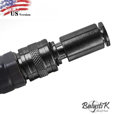 The Balystik Deluxe is a durable remote line, featuring an 8 mm nylon-braided tube, 1 m long. It includes two female quick-disconnect couplers—one at the regulator and one at the line’s end—that instantly stop airflow when disconnected, allowing you to keep air pressure in the regulator or the replica.