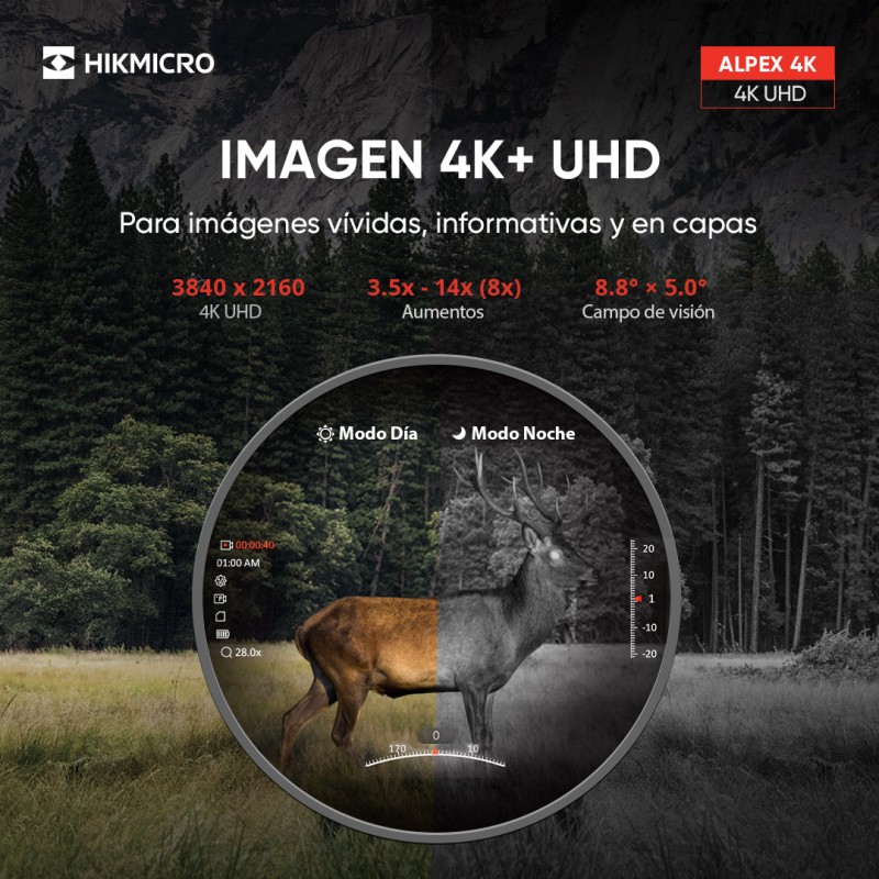 The new HIKMICRO Alpex LRF 4K A50EL digital day and night scope with rangefinder is perfect for use in any lighting condition. Enjoy full-color clarity during the day and sharp, classic black-and-white viewing at night. With 11 hours of battery life, the HIKMICRO Alpex LRF 4K A50E features a 3840 × 2160 UHD CMOS sensor, a 50mm lens that guarantees a detection range of up to 1,000 meters, and a sub-round OLED display with a 1920 × 1080 resolution and 0.49 inches. It also incorporates a laser rangefinder with a maximum measurement of 1,000 meters and an accuracy of ±1 m. It has a ballistic calculator and is perfect for both field and forest hunting.