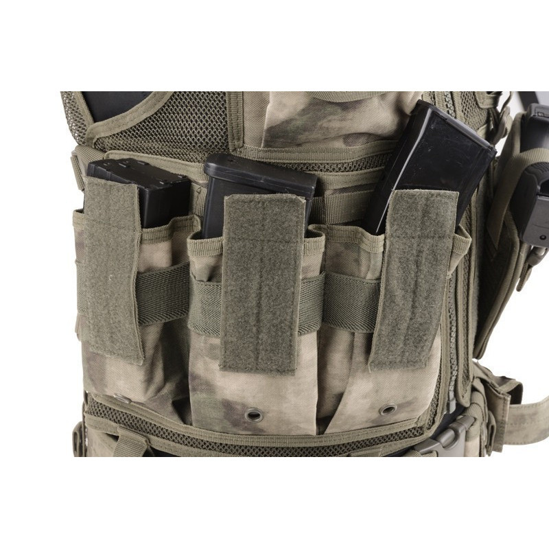 Left flap features radio pouch, three pistol magazine pouches and three single STANAG type magazine pouches. These are secured by hook&loop strap. This allows the pouches to be taken out and to install pistol holster in their place. The set includes belt secured with buckle. Additional pistol magazine pouches can be attached to the belt using hook&loop strap. The belt is adjustable.