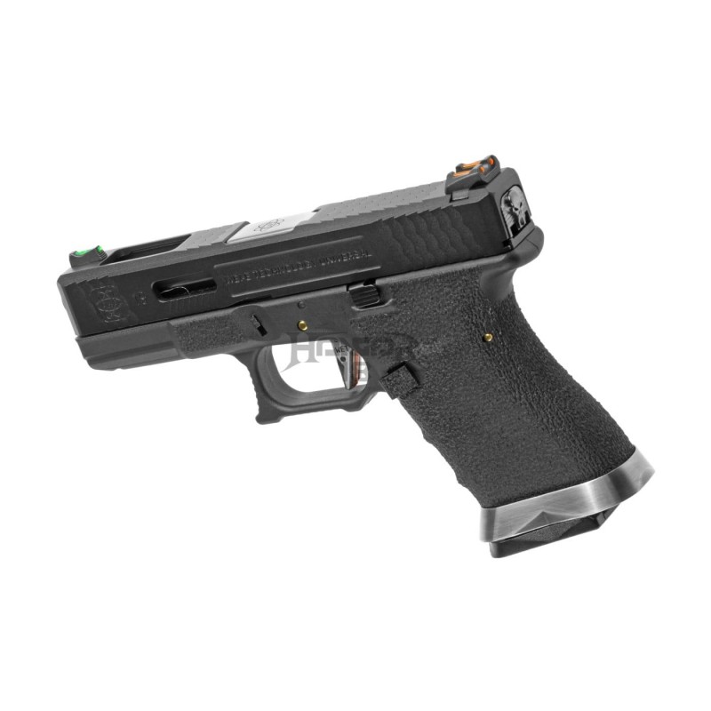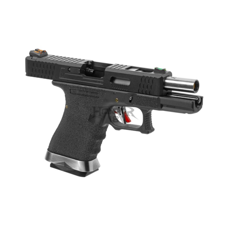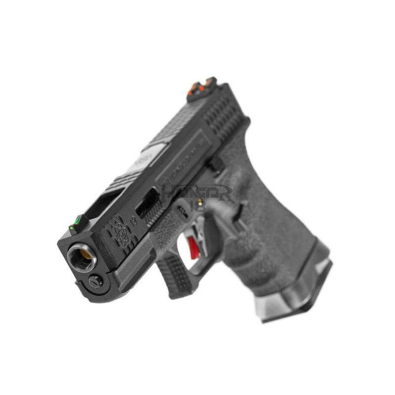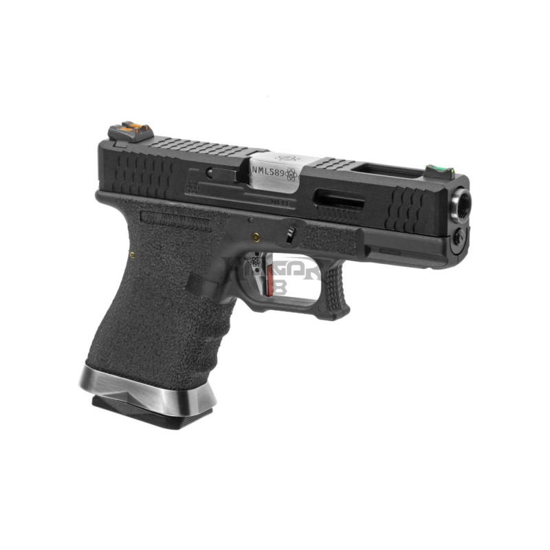 G-Force 19 BK Silver Barrel, manufactured by WE, is a semi-automatic replica of one of the most iconic pistols in the world. It is powered by green gas, weighs 730g, has a length of 185 mm, and offers a magazine capacity of 22 rounds. G-Force 19 uses an 80 mm long inner barrel and generates approximately 330 FPS.