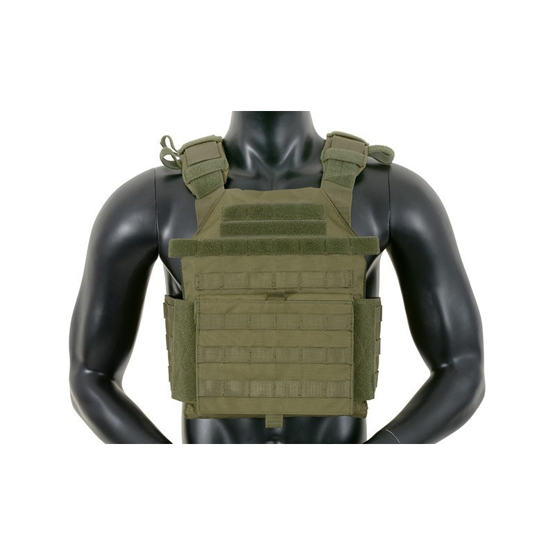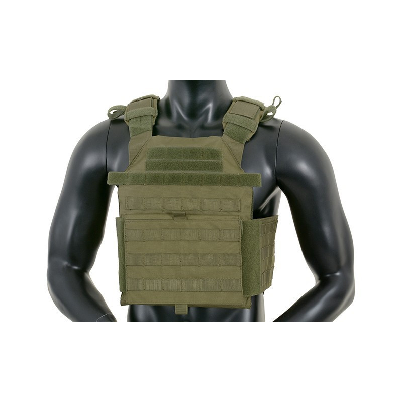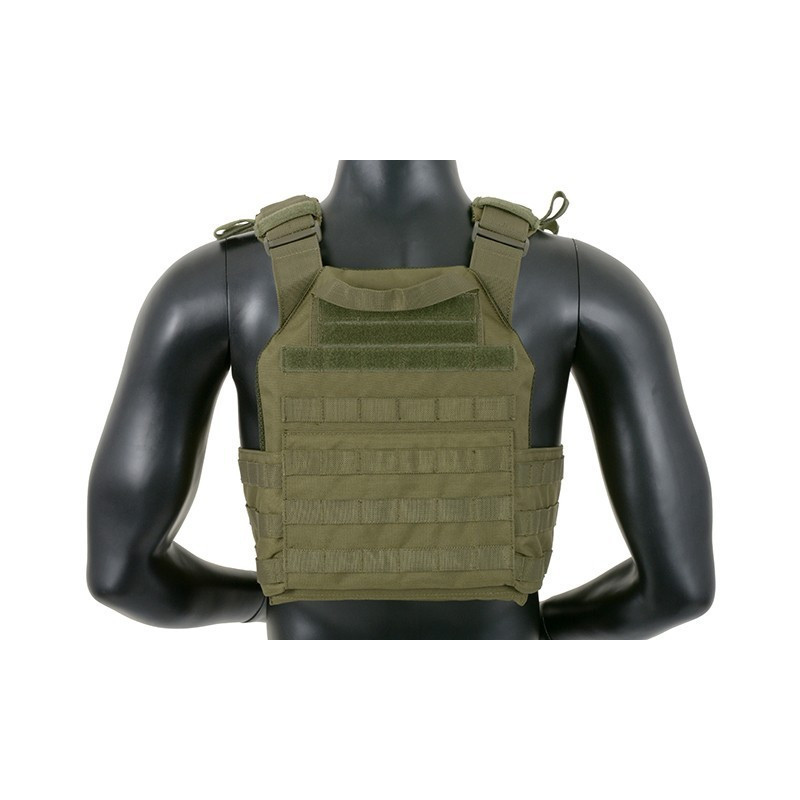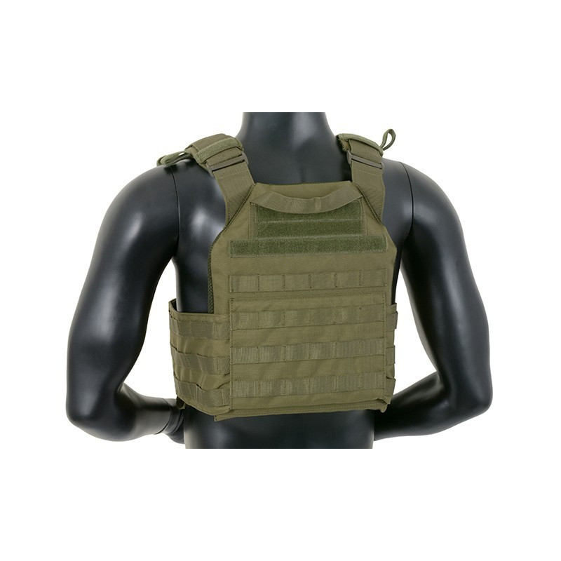 Features six rows of MOLLE/PALS style webbing from both side for modular attachments, 2 easy access pockets for standard plates, adjustable padded shoulder straps and waist straps with quick release buckles. The inside faces of the plate carrier are lined with breathable air mesh fabric. Pouches can be mounted inside and outside (PALS webbing) of the cummerbund. Included dummy ballistic plates.