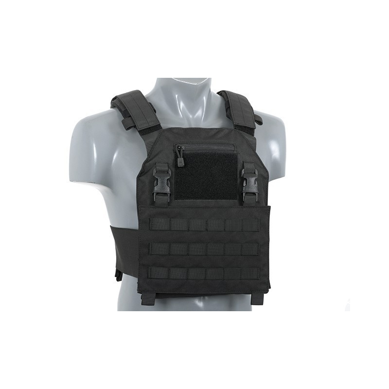 Comes with removable MOLLE front panel mounted by 2 clips and strong velcro. This system allows you to quickly remove the panel and replace it with a wide range of multi-purpose pouches or chest rigs. Now you can prepare yourself in a few seconds depending on the equipment you need. Features also 2 easy access pockets for standard plates and adjustable padded shoulder straps. The inside faces of the plate carrier are lined with breathable air mesh fabric. Pouches can be mounted on a front panel and outside (PALS webbing). Included dummy ballistic inserts and MOLLE front panel.