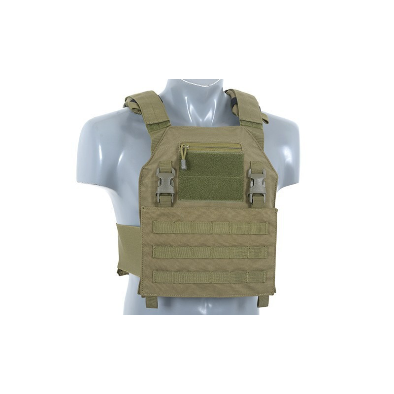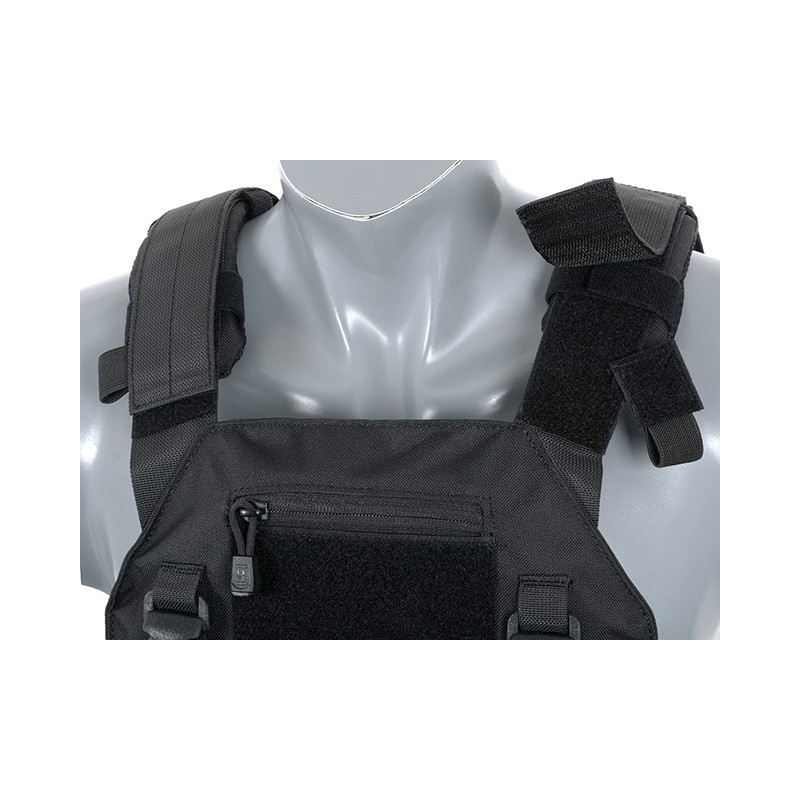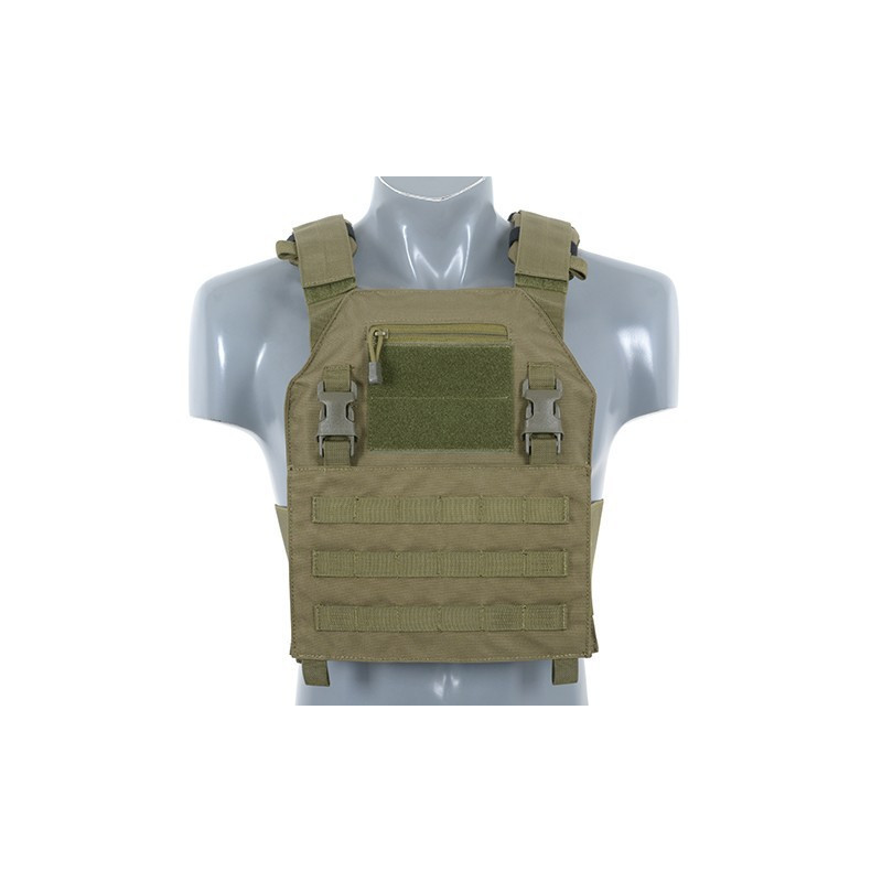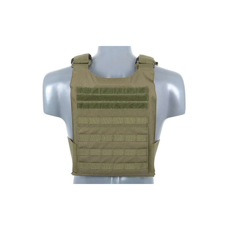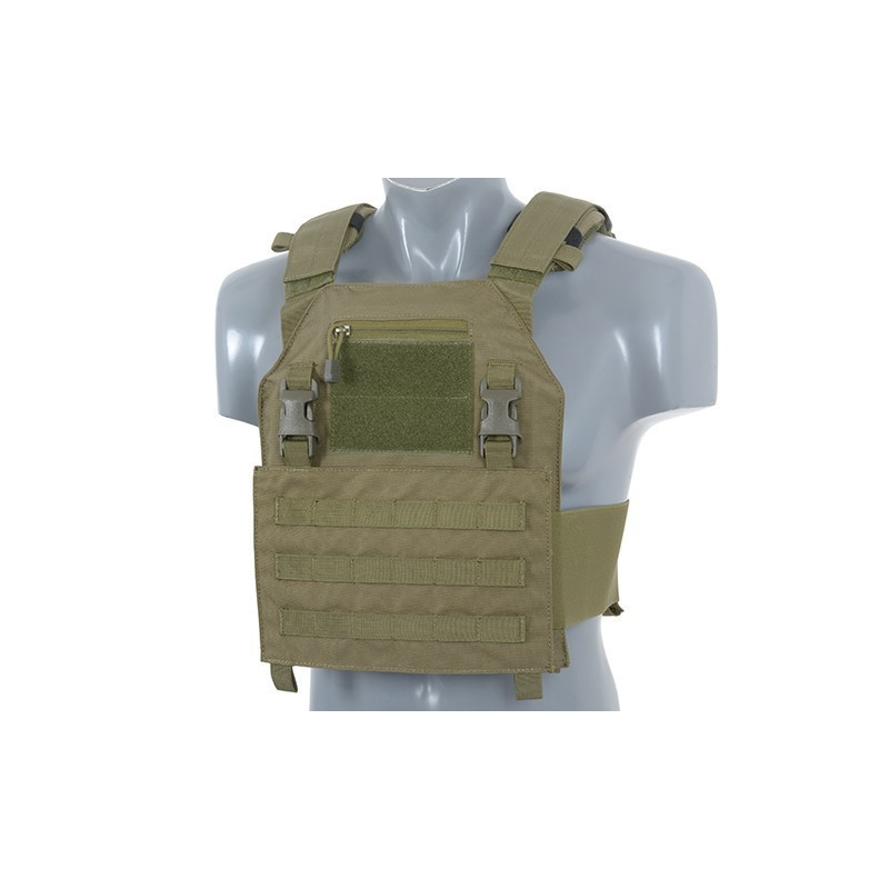 Comes with removable MOLLE front panel mounted by 2 clips and strong velcro. This system allows you to quickly remove the panel and replace it with a wide range of multi-purpose pouches or chest rigs. Now you can prepare yourself in a few seconds depending on the equipment you need. Features also 2 easy access pockets for standard plates and adjustable padded shoulder straps. The inside faces of the plate carrier are lined with breathable air mesh fabric. Pouches can be mounted on a front panel and outside (PALS webbing). Included dummy ballistic inserts and MOLLE front panel.