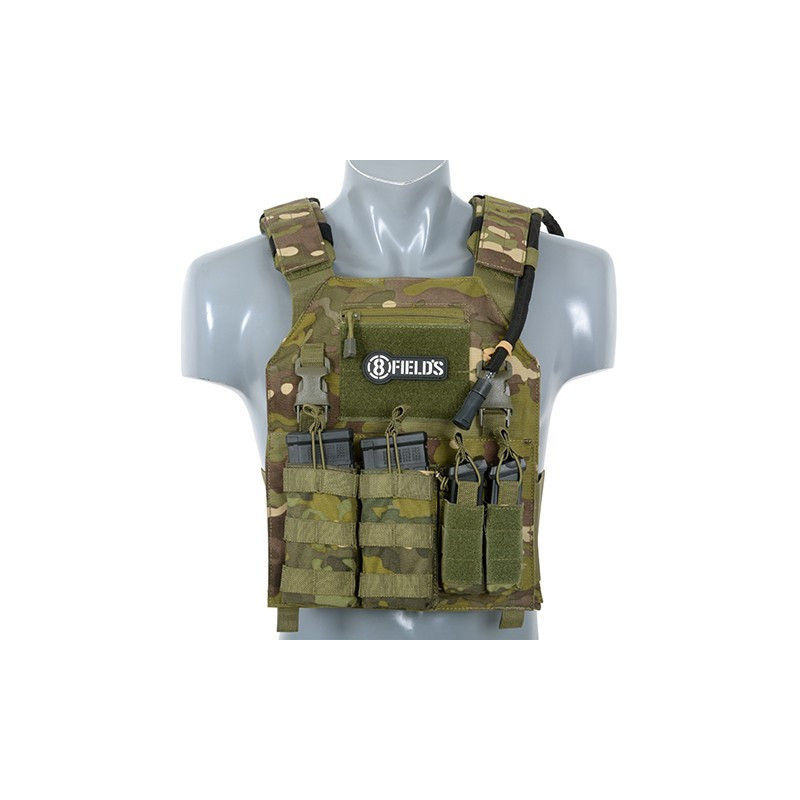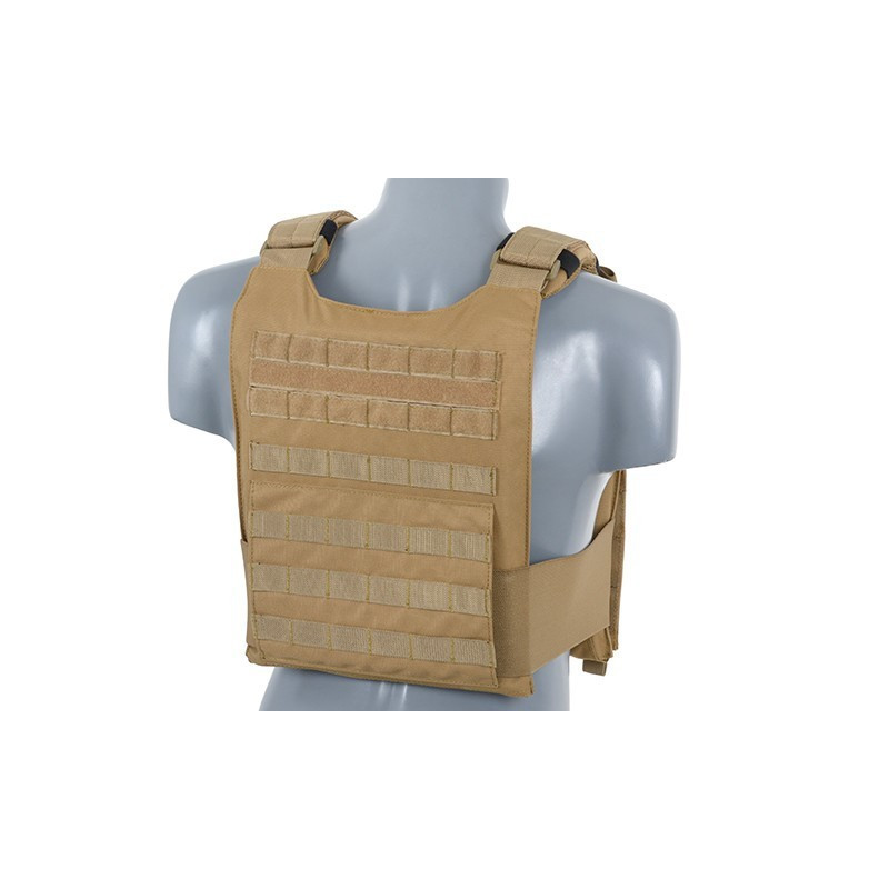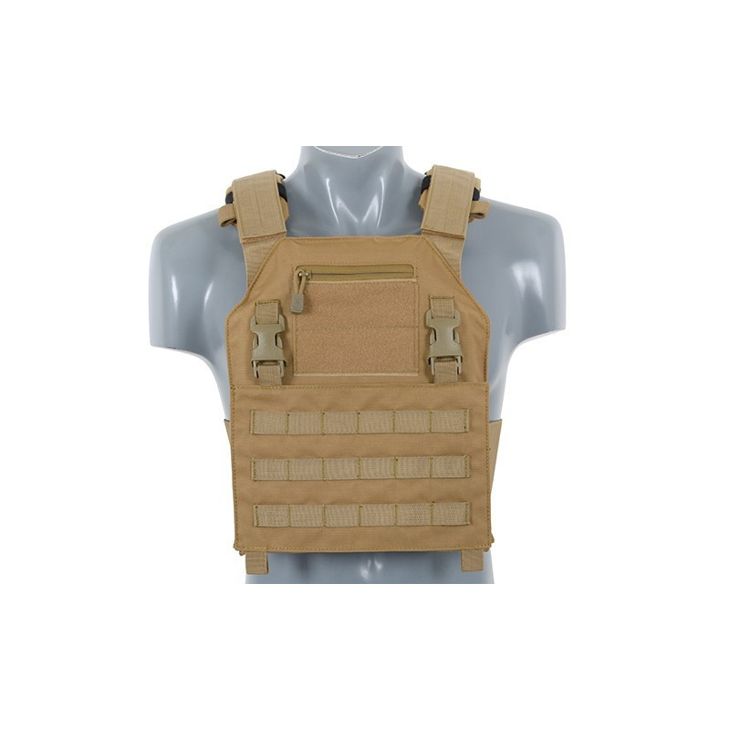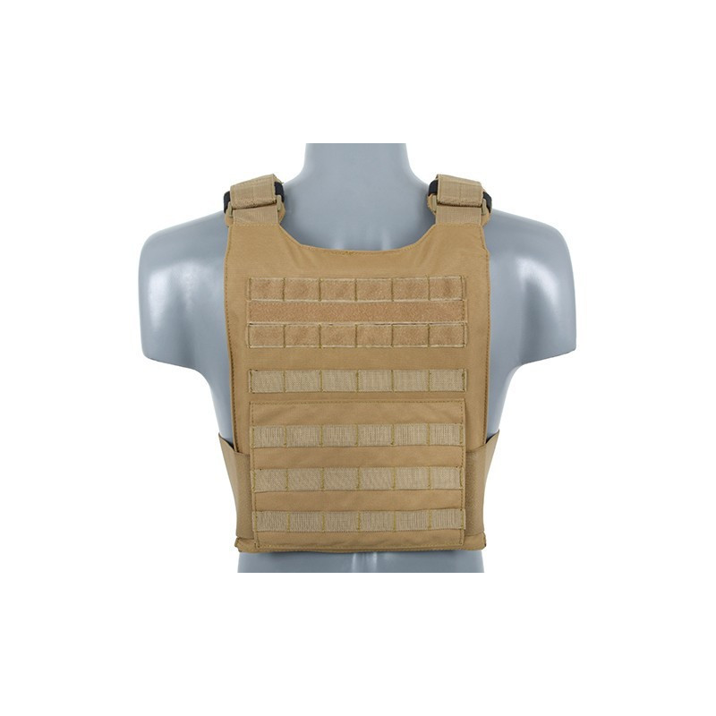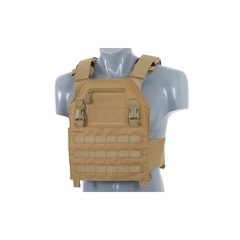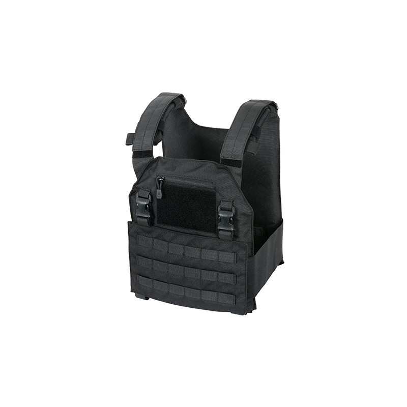 Comes with removable MOLLE front panel mounted by 2 clips and strong velcro. This system allows you to quickly remove the panel and replace it with a wide range of multi-purpose pouches or chest rigs. Now you can prepare yourself in a few seconds depending on the equipment you need. Features also 2 easy access pockets for standard plates and adjustable padded shoulder straps. The inside faces of the plate carrier are lined with breathable air mesh fabric. Pouches can be mounted on a front panel and outside (PALS webbing). Included dummy ballistic inserts and MOLLE front panel.