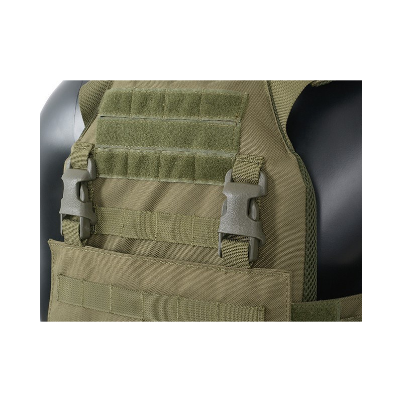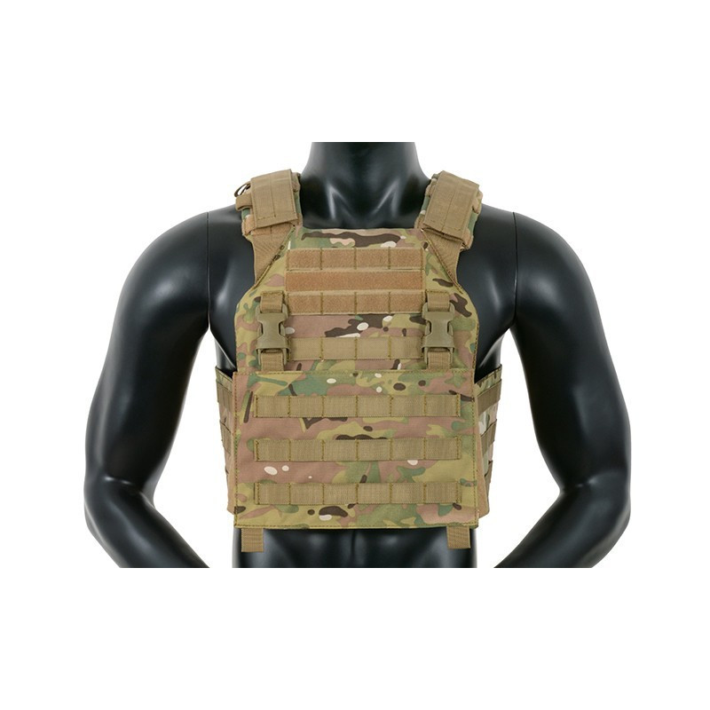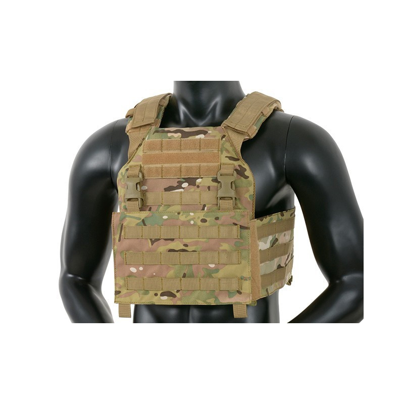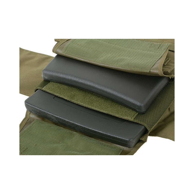 Comes with removable MOLLE front panel mounted by 2 clips and strong velcro. This system allows you to quickly remove the panel and replace it with a wide range of multi-purpose pouches or chest rigs. Now you can prepare yourself in a few seconds depending on the equipment you need. Features also 2 easy access pockets for standard plates, adjustable padded shoulder straps and cummerbund. The inside faces of the plate carrier are lined with breathable air mesh fabric. Pouches can be mounted on a front panel and outside (PALS webbing) of the cummerbund. Included dummy ballistic inserts and MOLLE front panel.