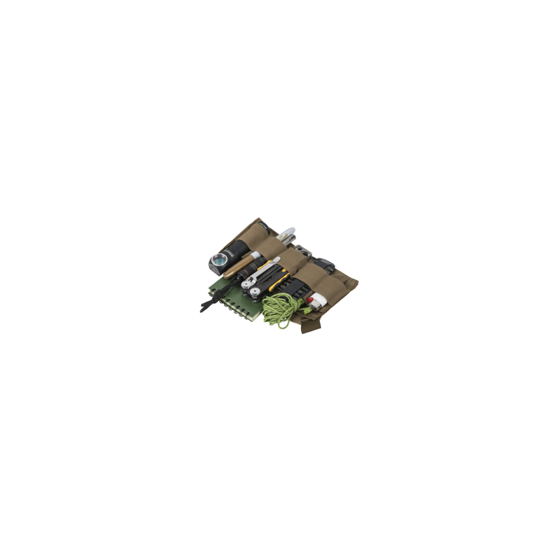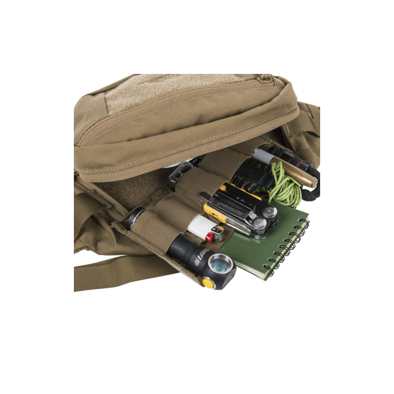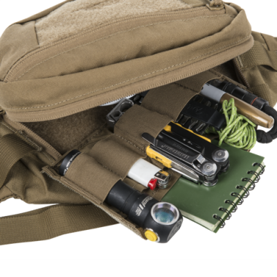 The Bandicoot® medium-sized waist pack offers several unique features in a smooth, low-profile design. It contains all everyday carry essentials like wallet, smartphone, first aid kit, snacks, gloves, etc. The spacious main chamber, apart from a zippered mesh pocket, has a detachable organizer with three flat pockets and five elastic bands, known from our Medical Line, which also serves in more civilian applications. Similar detachable panels are known from the Urban Admin Pouch and similar Versatile Insert System®-compatible products. Two outer zippered pockets (one of them a stealth pocket, placed on the inner side of the pack) allow the load to be evenly distributed. A two-way zipper allows easy access to the main chamber from either side. The adjustable hip belt can be used as a chest bandolier if the wearer chooses to hide it under a jacket. The hip belt can also be detached altogether if needed. Several elastic bands allow the pack to be quickly integrated into any MOLLE/PALS system. The Velcro ID panel on the outer pocket can be used for easy personalization.