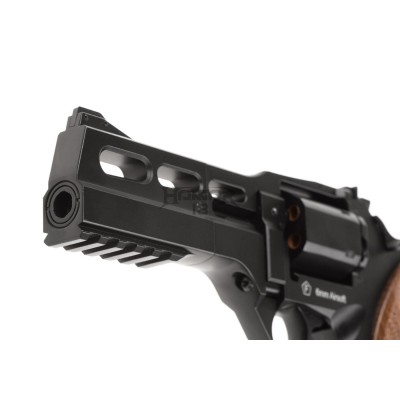 The Rhino 50DS is an airsoft replica of a quite unusual automatic revolver developed and manufactured by Chiappa in Italy. The firearm was designed by Emilio Ghisoni, who was also responsible for creating the Mateba Autorevolver. Both designs feature a DA/SA trigger mechanism and a much lower bore axis than more classical revolvers. The original is CNC machined from a solid block of Ergal - high-tensile 7075 aluminum alloy. Additional critical elements are machined from steel. Depending on the model, the firearm is manufactured in five barrel lengths and chambered in different pistol cartridges, including 9x19 Parabellum and .357 Magnum.