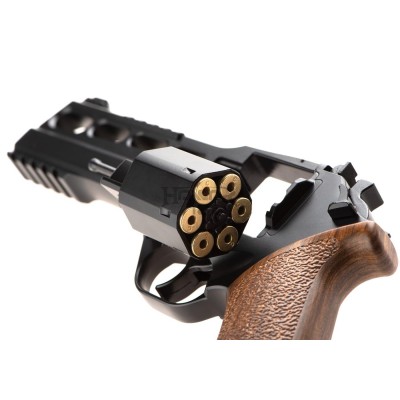 The Rhino 60DS model utilizes a revolving cylinder comprising six chambers, each storing a single BB in a mock cartridge. An excellent feature is a realistic mechanism for feeding dummy shells loaded into the cylinder. The Rhino 60DS perfectly reflects the appearance of the original, has a lower axis bore, and fires BBs from the bottom of the cylinder. It also utilizes the Double Action/Single Action trigger mechanism and high-visibility, adjustable iron sights.