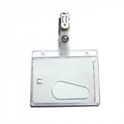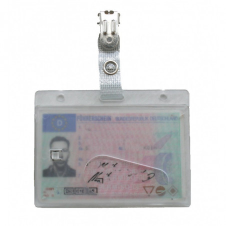Clear holder for ID, driver´s license, etc with clip that attaches to clothing or bags.
