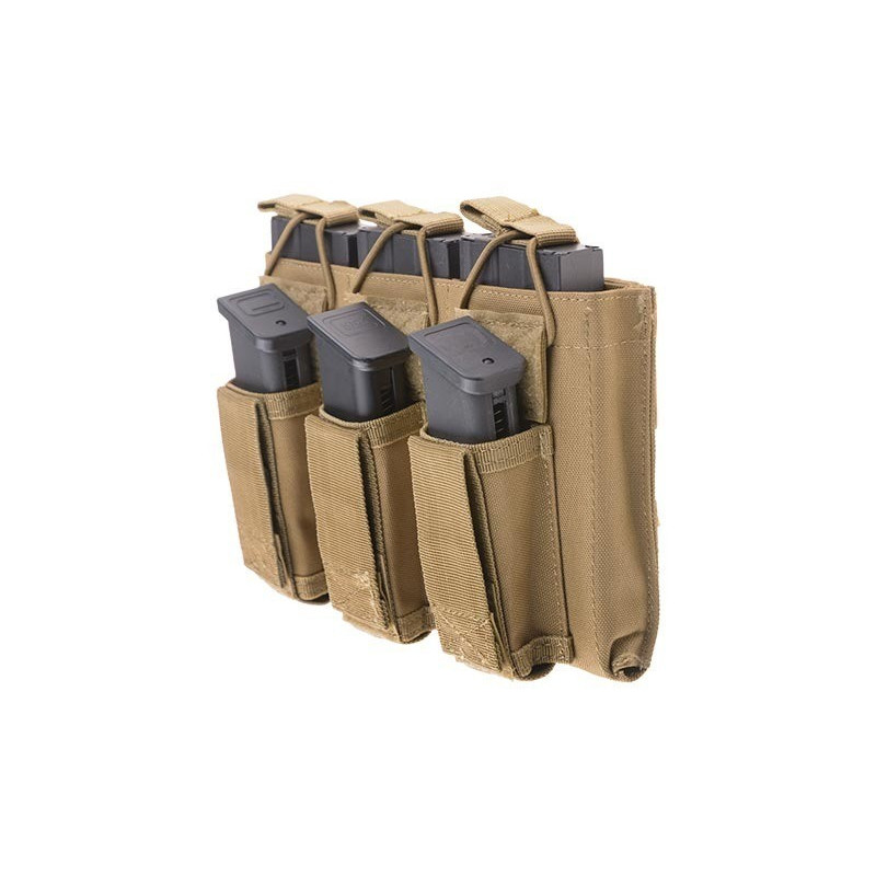 A triple pouch for AR-15 magazines and pistol magazines. Long magazines are secured with an elastic cord and a band that simplify taking them out, while short magazines are secured by a hook and loop fastener flap.