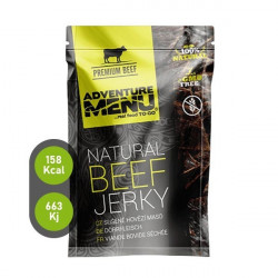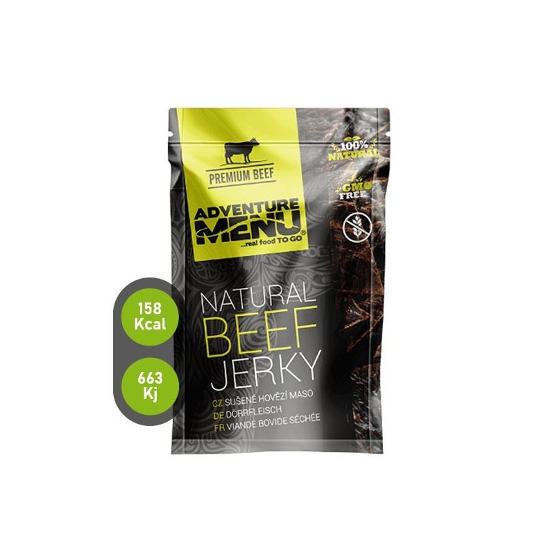 Descrição: Feito da melhor carne de vacae sem quaisquer aditivos a não ser sal. AdventureMenu CARNE SECA é o petisco perfeito para a sua viagem ao ar livre ou para um dia de trabalho atarefado. O elevado teor de proteínas (até 77%) irá regenerar o seu corpo e sem qualquer gordura, irá mantê-lo activo durante todo o dia.