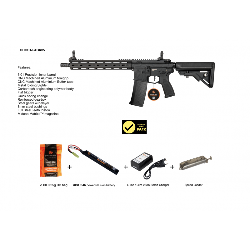 A AEG Evolution Combat [Evolution Airsoft] é uma réplica de alto desempenho, construída com Technopolymer Carbontech, garantindo leveza e resistência. O modelo traz um conjunto interno reforçado, incluindo gearbox de última geração, cano de precisão 6.01 mm e gatilho eletrônico E.T.S..