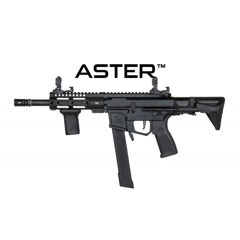 Submetralhadora elétrica de airsoft (AEG) com sistema GATE ASTER, ideal para CQB e jogos táticos.