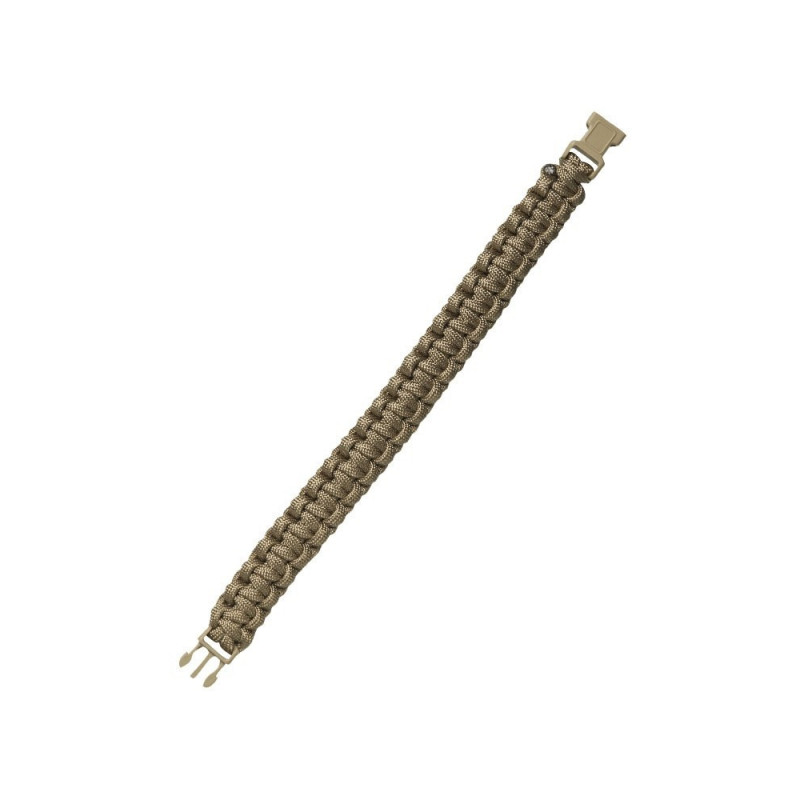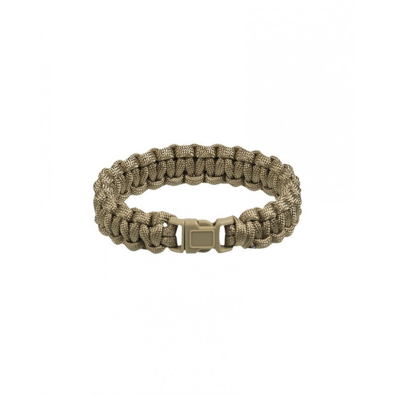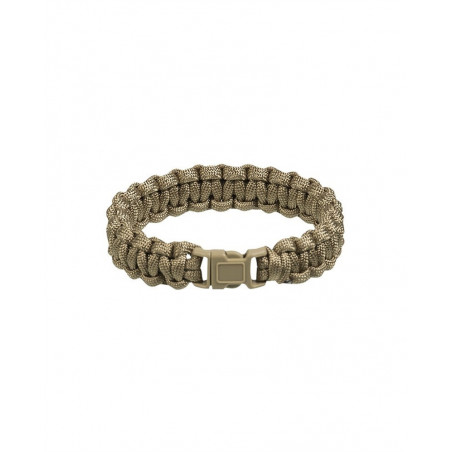 Pulseira feita de corda trançada de paraquedas com fecho de plástico.