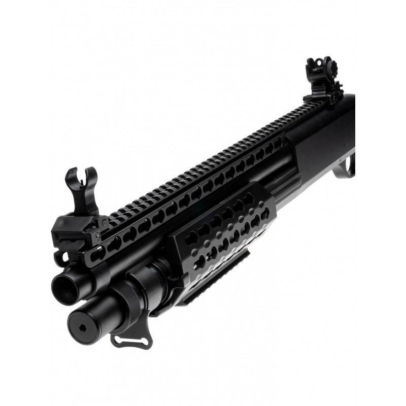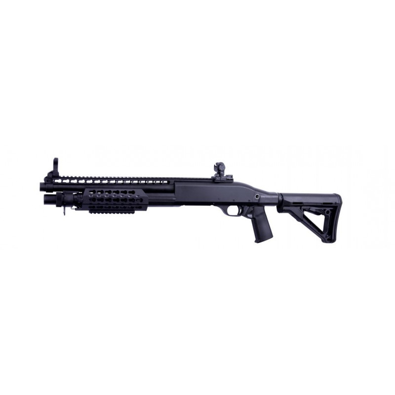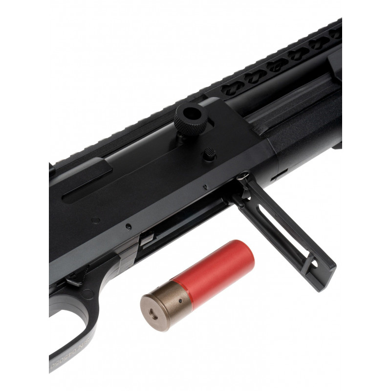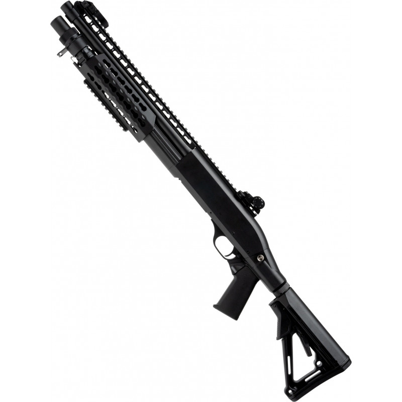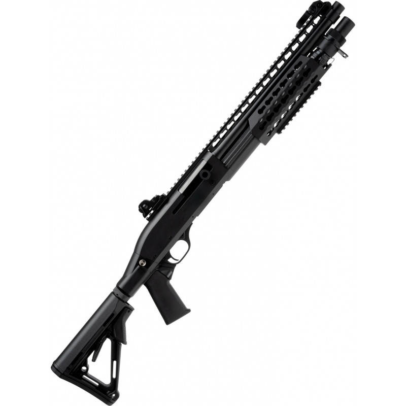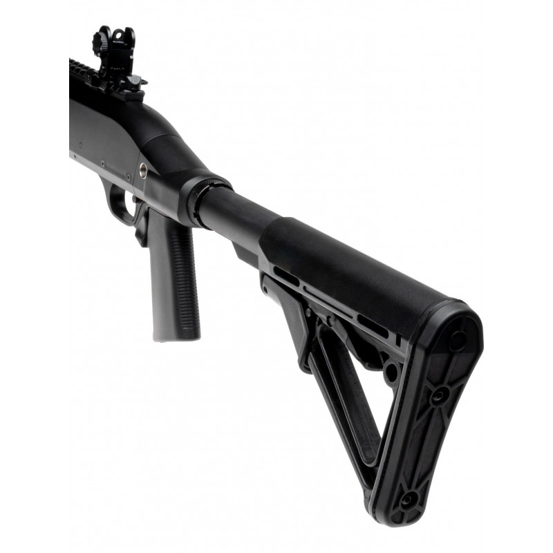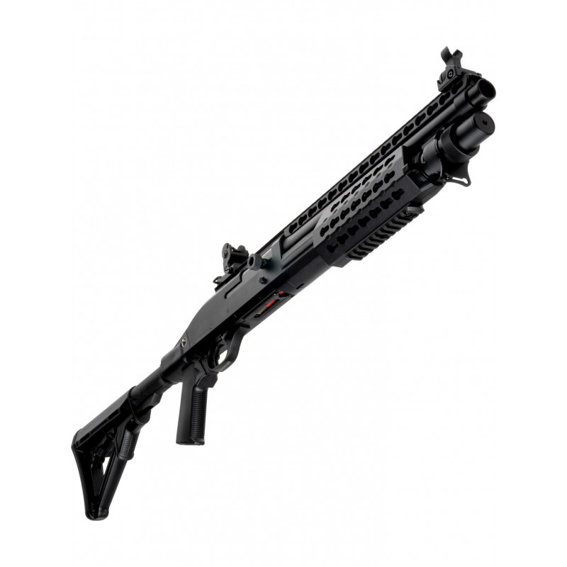 Uma caçadeira a mola Tri-Shot, que vem incluída com um cartuxo e um Speedloader, bem como um guarda-mão KeyMod/RIS e coronha deslizante estilo AR. Se você gosta de ficar próximo do pessoal no CQB, esta Shotgun é definitivamente para você.