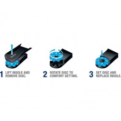 Você pode escolher entre almofada, suporte firme, interno ou externo. Usando a tecnologia do disco para selecionar a zona de conforto ideal para você, basta remover a palmilha, remover o disco, girar o disco para a sua configuração, substituir o disco e a palmilha. É fácil selecionar seu nível de conforto.