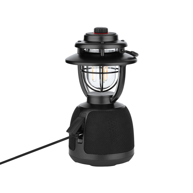 Lanterna de acampamento estilo retro com alto-falante incluído e dois modos de luz: frio e quente. Funciona como carregador de celular em situações de emergência.