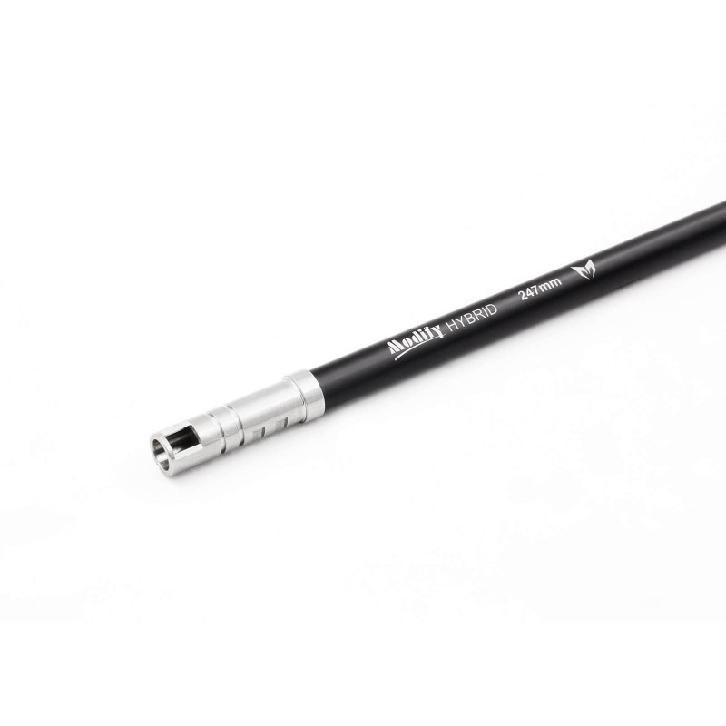O Cano de Precisão Híbrido da Modify tem 247 mm de comprimento com diâmetro interno de 6,03 mm, adequado para CAR15, P90, G36C, SIG552. Feito de aço inoxidável de alta qualidade e liga de alumínio para aeronaves, o cano é extremamente direito com alta rigidez, o que permite que as AEGs alcancem maior alcance e melhor desempenho geral. O design do O-Ring reduz a vibração do cano para melhorar a precisão.