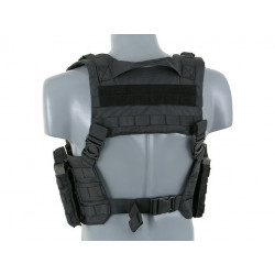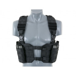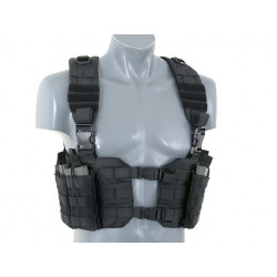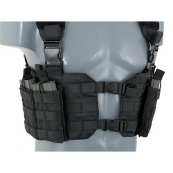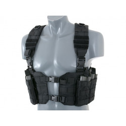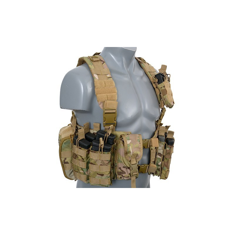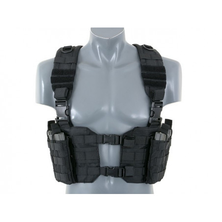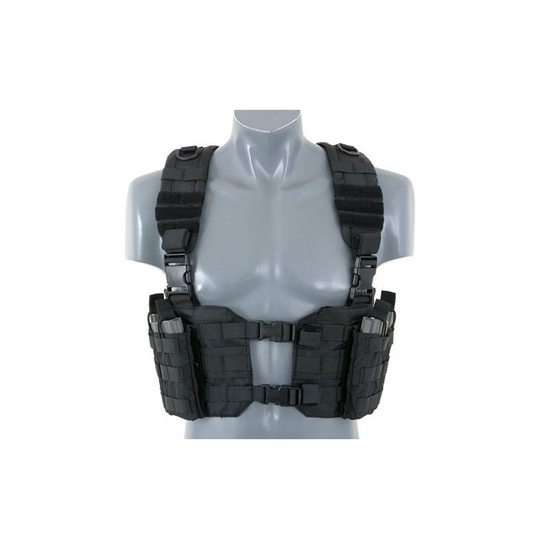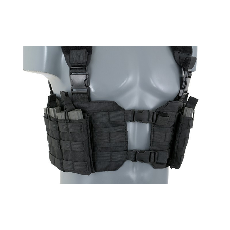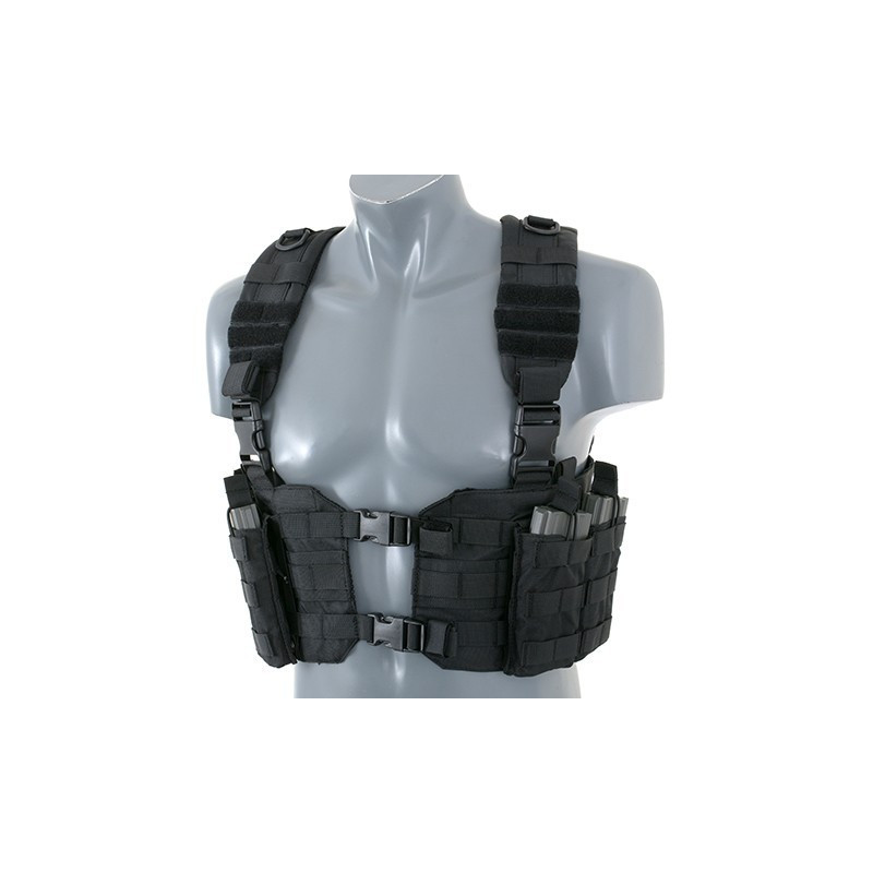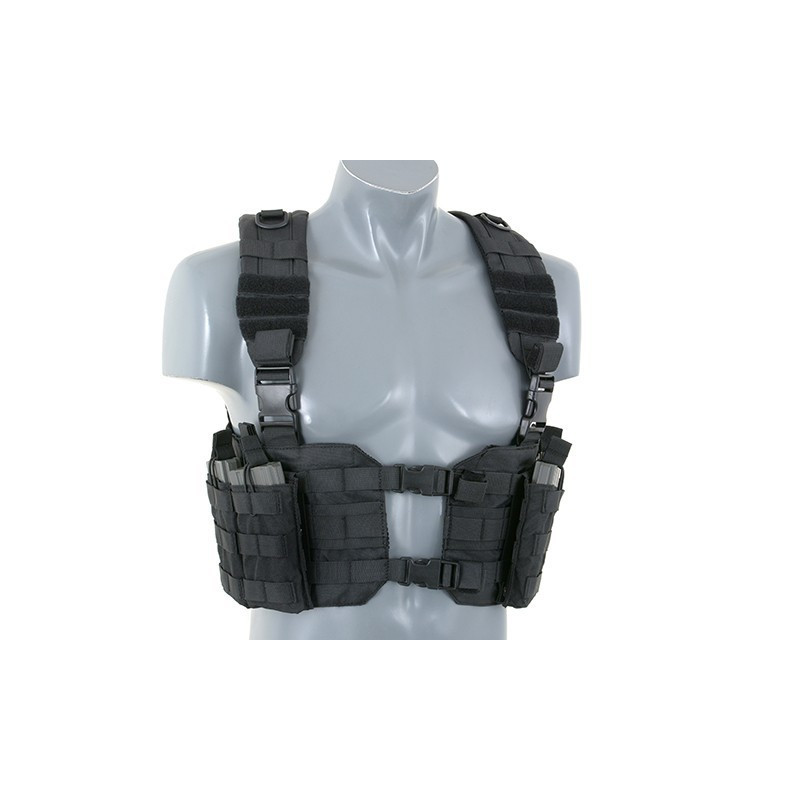 O Chest Harness é bastante utilizado por soldados profissionais para carregar magazines e outros itens essenciais. O corpo do arnês do tórax apresenta um fecho da fivela QR do centro para facilitar a remoção do equipamento do seu corpo. As alças acolchoadas ajustáveis e um arnês traseiro H ajustável permitem que este equipamento se adapte a qualquer tamanho do operador.