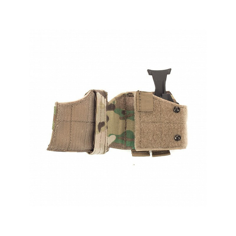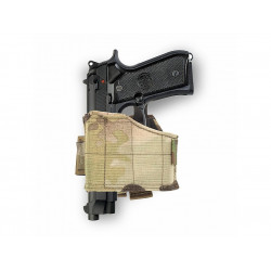 O ajuste é simples e rápido graças ao velcro. Os armamentos são presos com firmeza por meio de um alojamento interno composto moldado. A arma é libertada pressionando o botão com o  polegar para baixo.