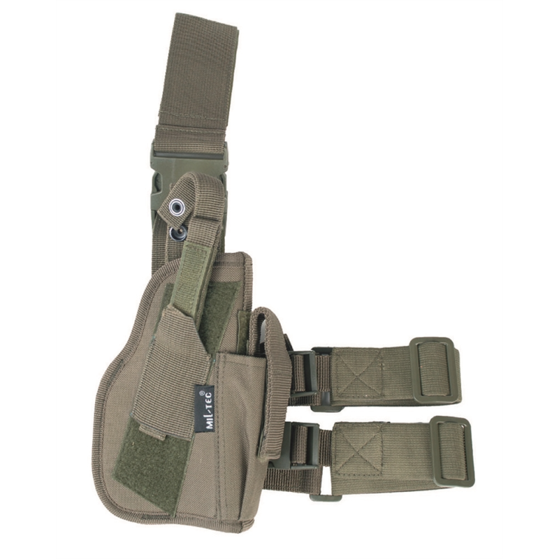 Coldre de perna ajustável com bolso para carregador, ideal para uso com pistolas comuns e cinto de serviço.