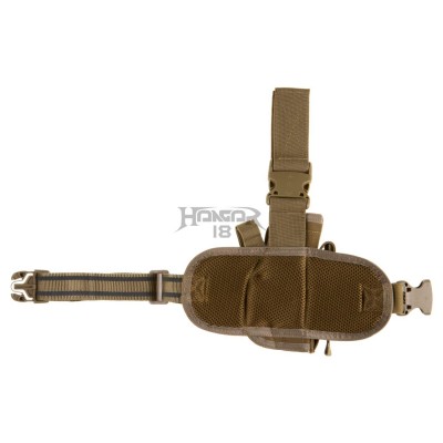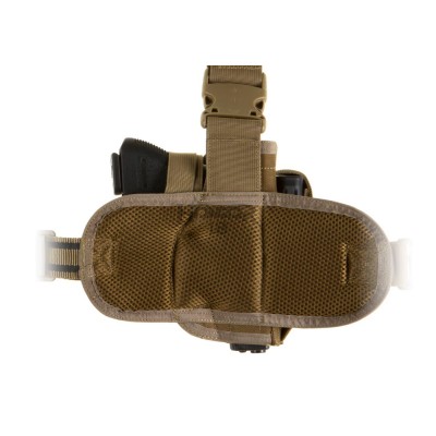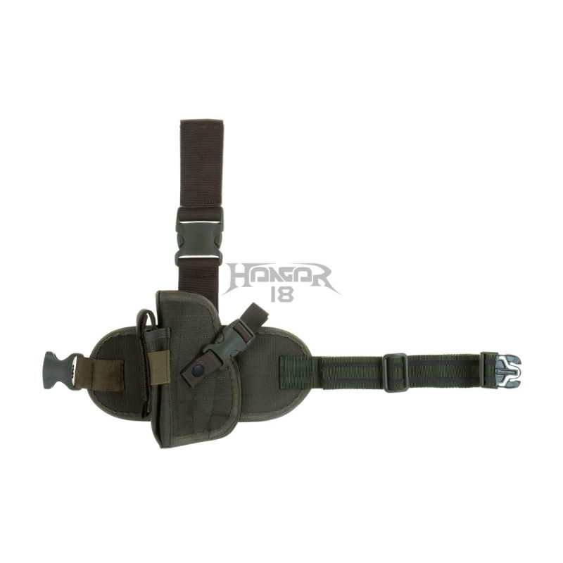 Versão para canhotos do coldre universal Dropleg, projetado para se adaptar a uma ampla variedade de pistolas de médio porte, como por exemplo a Glock 17 ou a Beretta 92. Ele é equipado com bolsa para carregador e painel de perna integrados, presos com um clipe de cinto e três tiras elásticas antiderrapantes na coxa.