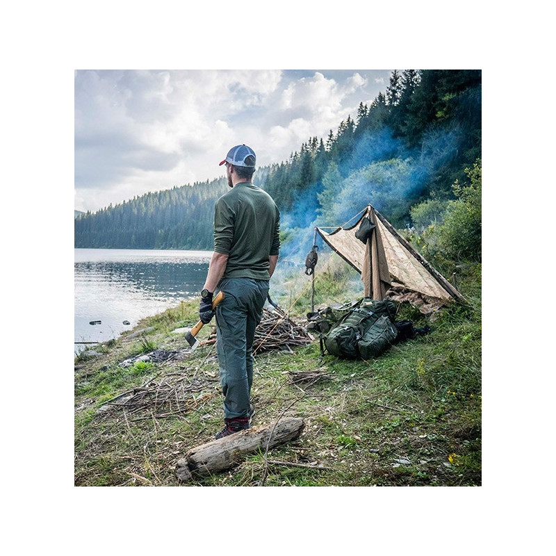Poncho impermeável de secagem rápida, feito de poliéster Rip-Stop. Possui botões de pressão que permitem fazer mangas ou conectar dois ponchos. O capuz está equipado com um cabo de ajuste. A grande vantagem deste poncho é seu peso leve e tamanho pequeno quando dobrado - quando comprimido, o poncho cabe numa sacola de 14x22 cm.